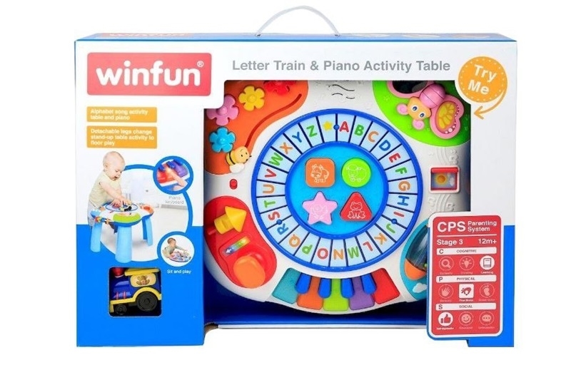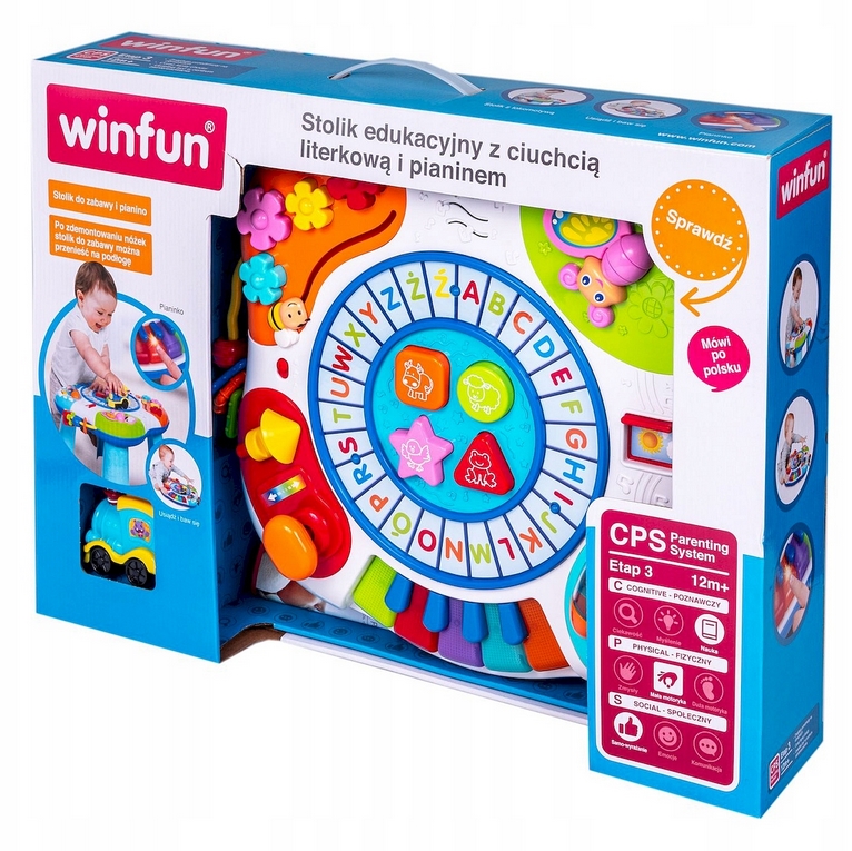 Na kolorowym blacie stolika Smily Play znajdziesz tory z literkami, po których jeździ wydająca dźwięki lokomotywa, grające pianinko, przesuwane okienko, dzięki któremu można zmienić porę dnia, barwne przyciski w różnych kształtach, które wydają dźwięki – jedne grają melodie, po naciśnięciu innych usłyszysz odgłosy zwierzątek. Stolik posiada także obrotowe grzechotki o różnych fakturach i kształtach, obracający się walec, we wnętrzu którego znajdują się kolorowe, grzechoczące kulki, a nawet dźwignię zmiany biegów, obok której znajduje się żółty gwizdek. Stoliczek edukacyjny został wyposażony także w bzyczącą pszczółkę, którą można przesuwać po falistej linii, a także mówiącego motylka z lusterkiem i ruchomym skrzydełkiem. Wbudowane w zabawkę światełka przyciągną wzrok brzdąca.