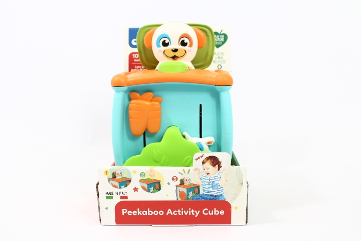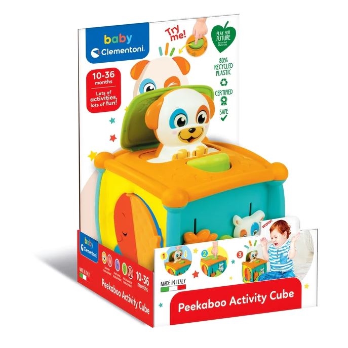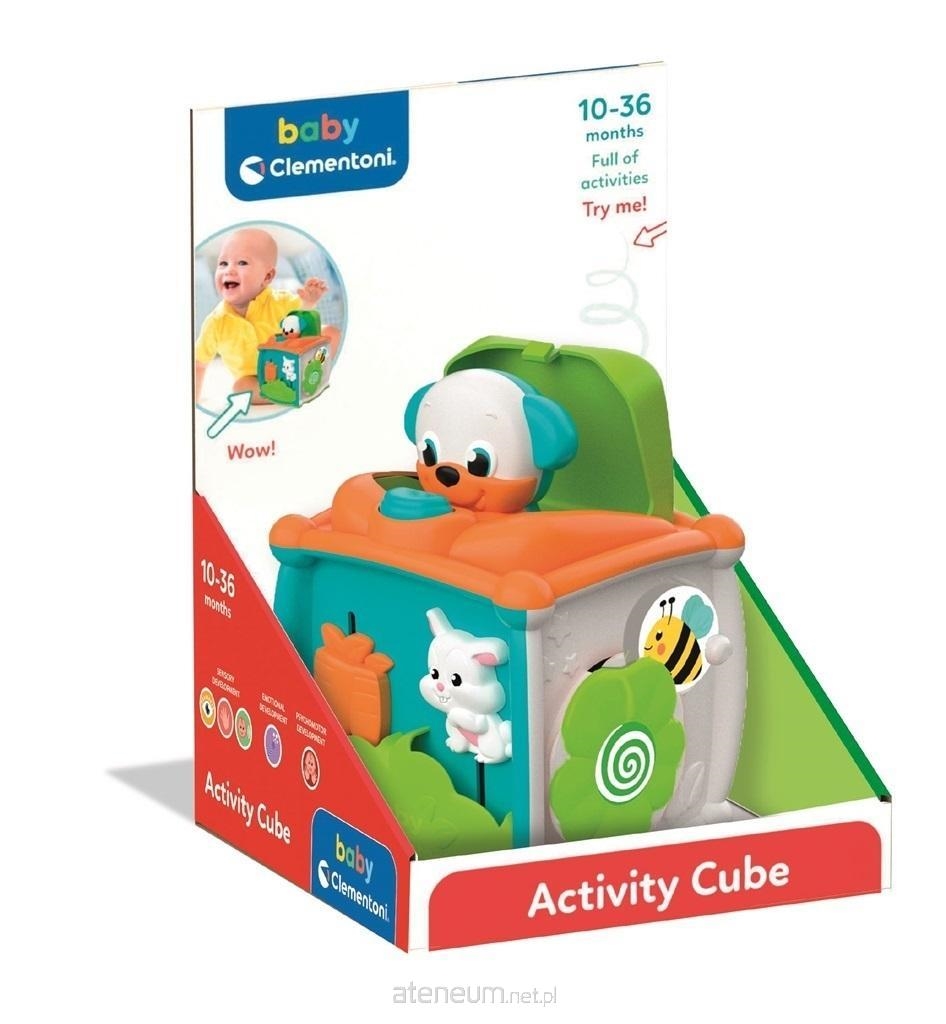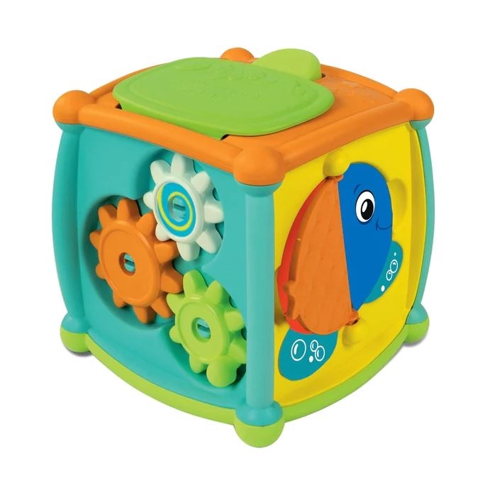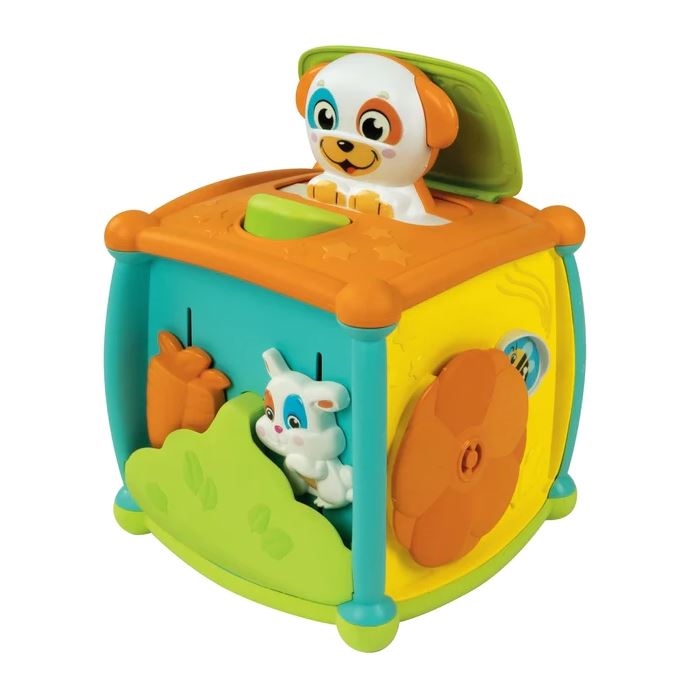 Magiczna kostka pełna zaskakujących możliwości zabawy. Pięć zróżnicowanych obszarów gry pozwala dziecku skupiać uwagę na jednej aktywności na raz, wspierając w ten sposób koncentrację. Naciśnięcie przycisku powoduje otwarcie się wieka i wyskoczenie małego pieska. Efekt zaskoczenia gwarantowany! Obracanie kwiatkiem sprawia, że pszczółka lata wokół niego. Króliczek skacze, aby złapać marchewkę, podczas gdy rybka obraca stronę, bawiąc się w „a kuku!”. Koła zębate stymulują sprawność manualną. Kostka oferuje bodźce sensoryczne, zachęca do wychwytywania związków przyczynowo-skutkowych, stymuluje motorykę i ciekawość.