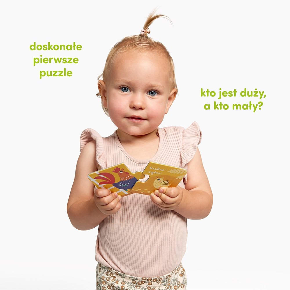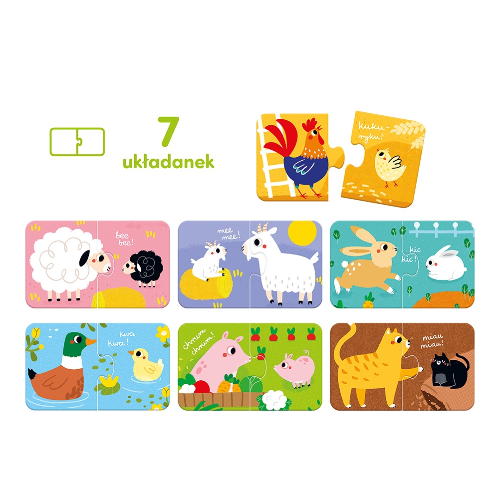 Hej, maluchy! Czy wiecie, jakie zwierzątka brykają w gospodarstwie? Puzzle do pary Zwierzątka z gospodarstwa to poręczny edukacyjny zestaw. Zawiera 7 soczyście kolorowych, dwuelementowych układanek, które przedstawiają małe i duże zwierzątka ze wsi. To świetny pomysł na pierwsze puzzle dla dzieci powyżej 1 roku życia.