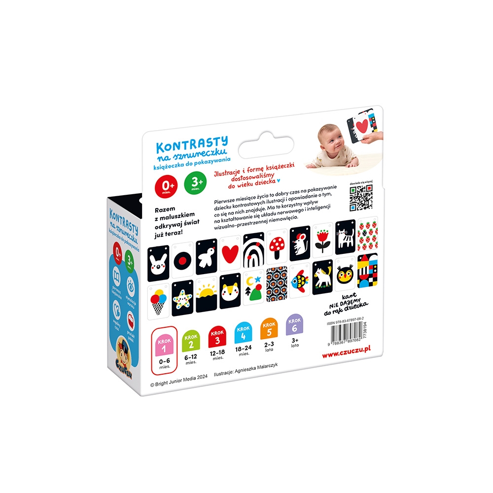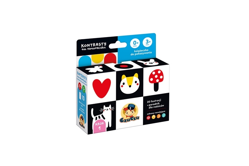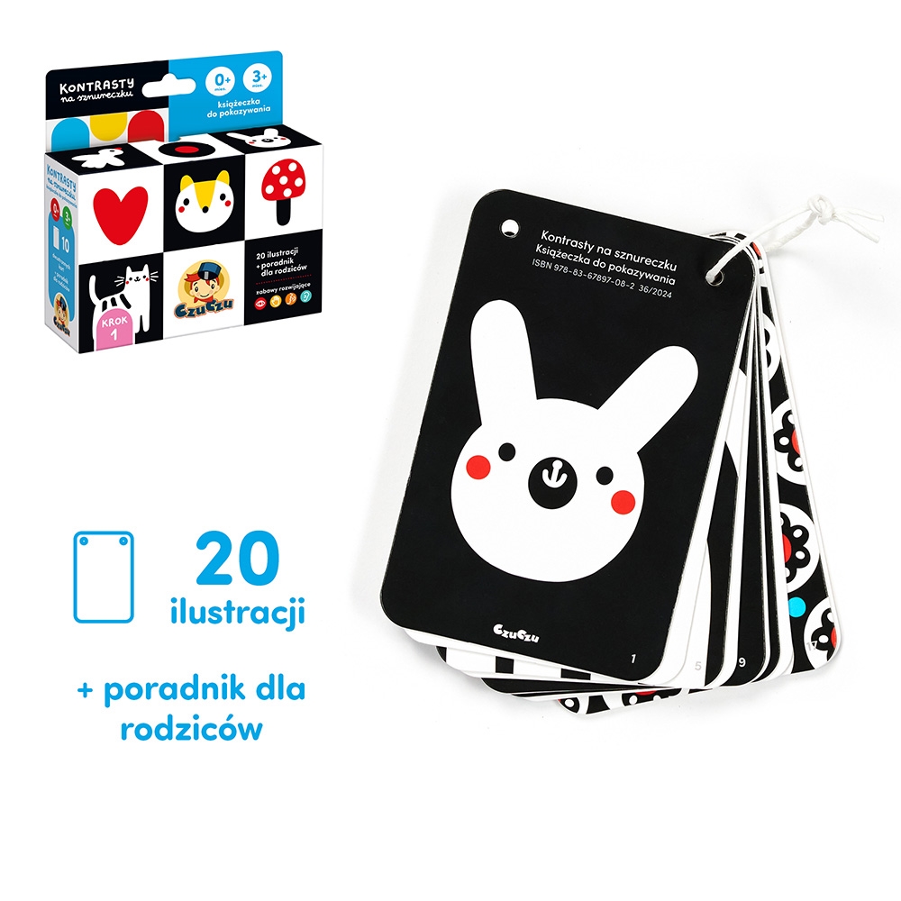 Poręczna książeczka na sznureczku zawiera 20 ilustracji. Wyraźne kontrastowe wzory przyciągają wzrok i uwagę maluszka. Oglądajcie je razem, opowiadaj o tym, co na nich widać. To doskonały sposób na wspólne spędzanie czasu z maluszkiem i budowanie wyjątkowej więzi. Do zestawu dołączyliśmy poradnik pełen informacji o rozwoju wzroku niemowląt i pomysłów na zabawę.