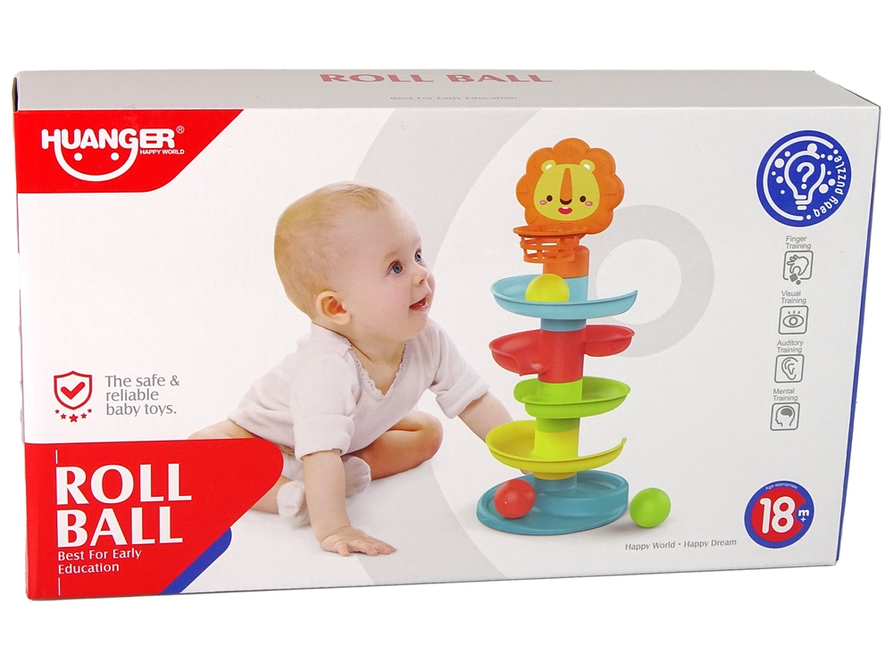 Kolorowa zjeżdżalnia dla piłeczek to świetna zabawa, która nauczy Twoje dziecko, w jaki sposób kuliste kształty poruszają się po pochyłych powierzchniach. Wewnątrz kulek znajdują się drobne elementy, które grzechoczą podczas turlania się. Zjeżdżalnia składa się z 5 kolorowych poziomów, które musi pokonać położona przez dziecko piłeczka. Na czubku znajduje się mały lew z koszem. Maluch bawiąc się, będzie próbował trafić do kosza, ćwicząc przy tym koordynację, celność i zdolności manualne.
