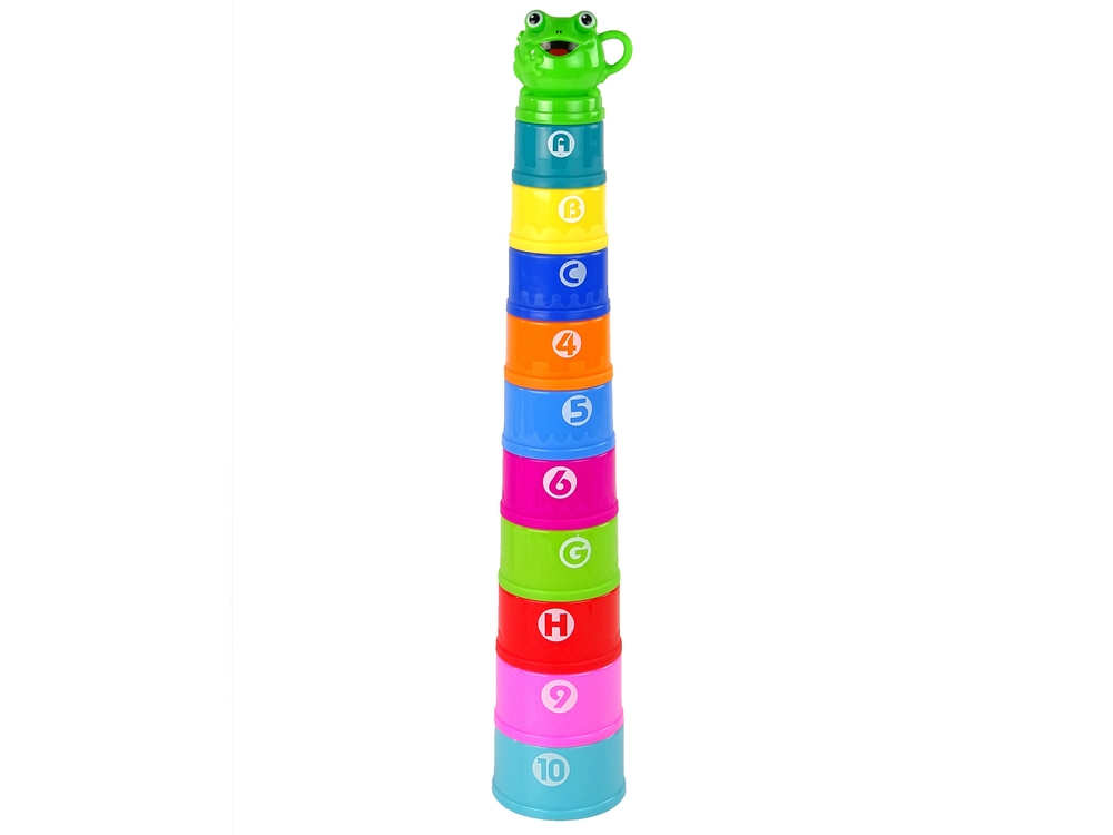 Składa się z kubeczków w różnych kolorach. Na szczycie zabawki znajduje najmniejsza niespodzianka- żabka. Wykonane są z bezpiecznego, nietoksycznego materiału, który odznacza się solidnością i wytrzymałością. Piramidka ma bardzo opływowy, zaokrąglony kształt, co wpływa na poziom bezpieczeństwa płynący z korzystania z przedmiotu. Na każdym kubeczku znajduje się cyfra i litera, maluch może rozpocząć naukę już na wczesnych etapach swojego życia.