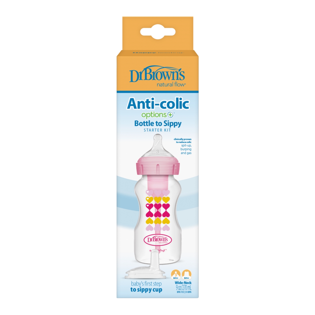 Butelka Dr Brown’s Options+ szeroka szyjka o pojemności 270ml występuje w różnych wzorach i kolorach.