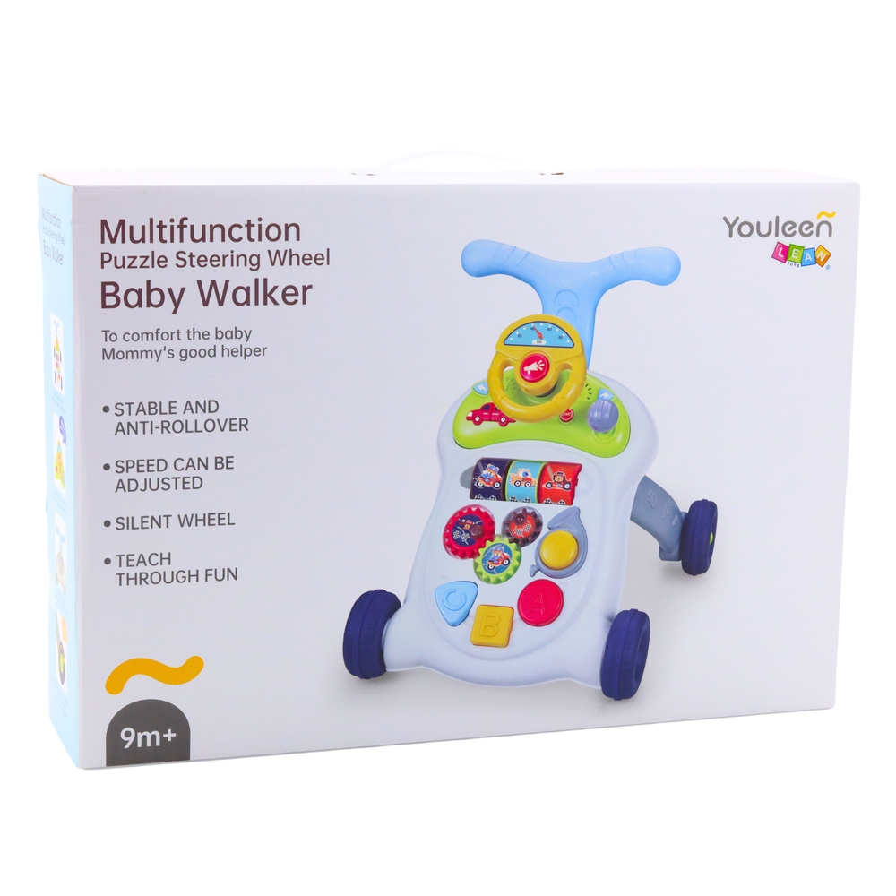 INTERAKTYWNY CHODZIK PCHACZ Z KIEROWNICĄ Wielofunkcyjny chodzik dla dzieci to doskonałe wsparcie w nauce chodzenia i rozwijania koordynacji ruchowej. Dzięki solidnej konstrukcji i szerokim kołom zapewnia stabilność oraz bezpieczeństwo podczas pierwszych kroków malucha. Wyposażony w interaktywny panel z kierownicą, zabawka nie tylko wspiera rozwój fizyczny, ale także pobudza ciekawość dziecka poprzez efekty dźwiękowe, światła oraz różnorodne elementy sensoryczne. Chodzik posiada regulację wysokości, dzięki czemu można dostosować go do wzrostu dziecka. Dodatkowo możliwość regulacji prędkości pozwala na dostosowanie tempa jazdy do umiejętności malucha, co zwiększa komfort użytkowania. Interaktywny panel zawiera zdejmowaną kierownicę, dzięki której dziecko może poczuć się jak prawdziwy kierowca. Przyciski, obracane koła zębate i kolorowe światełka pobudzają wyobraźnię i zachęcają do aktywnej zabawy. Chodzik wykonany jest z wysokiej jakości materiałów, co zapewnia trwałość i bezpieczeństwo. Dzięki swojej funkcjonalności oraz atrakcyjnemu designowi stanowi idealny pomysł na prezent dla dziecka powyżej 9. miesiąca życia. SPECYFIKACJA: Wymiary chodzika: 46 cm x 45 cm x 43,5cm Wymiary opakowania: 55 cm x 38cm x 12,5 cm Regulacja wysokości: Tak Regulacja prędkości kół: Tak Interaktywny panel: Światła, dźwięki, ruchome elementy Materiał: Wysokiej jakości tworzywo sztuczne Zasilanie: Baterie 3 x 1.5V AA (brak w zestawie) ZAWARTOŚĆ ZESTAWU: Interaktywny chodzik Panel sensoryczny z kierownicą Instrukcja obsługi