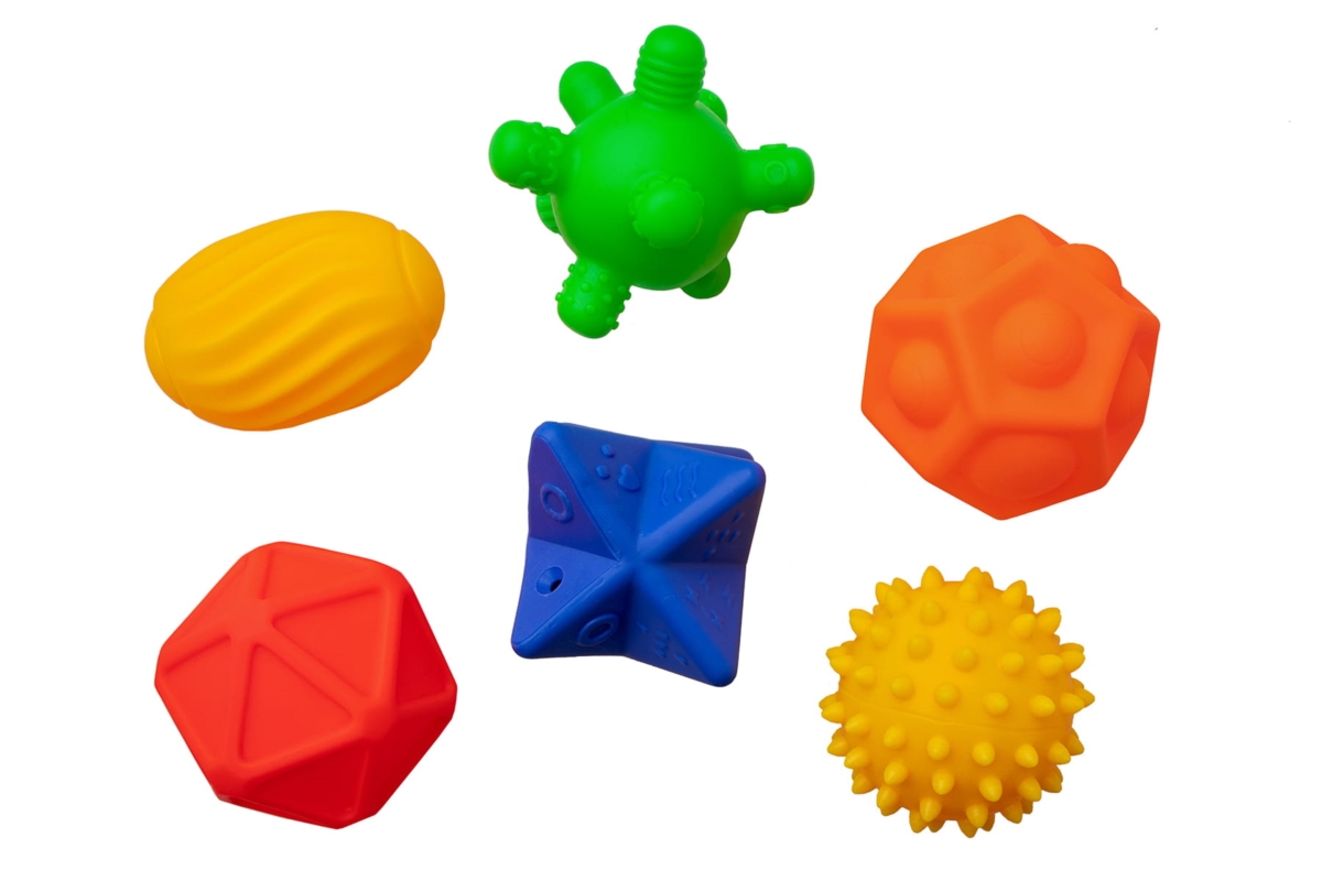 Zestaw zawiera 6 piłeczek sensorycznych w różnych rozmiarach, z ciekawymi wypustkami.