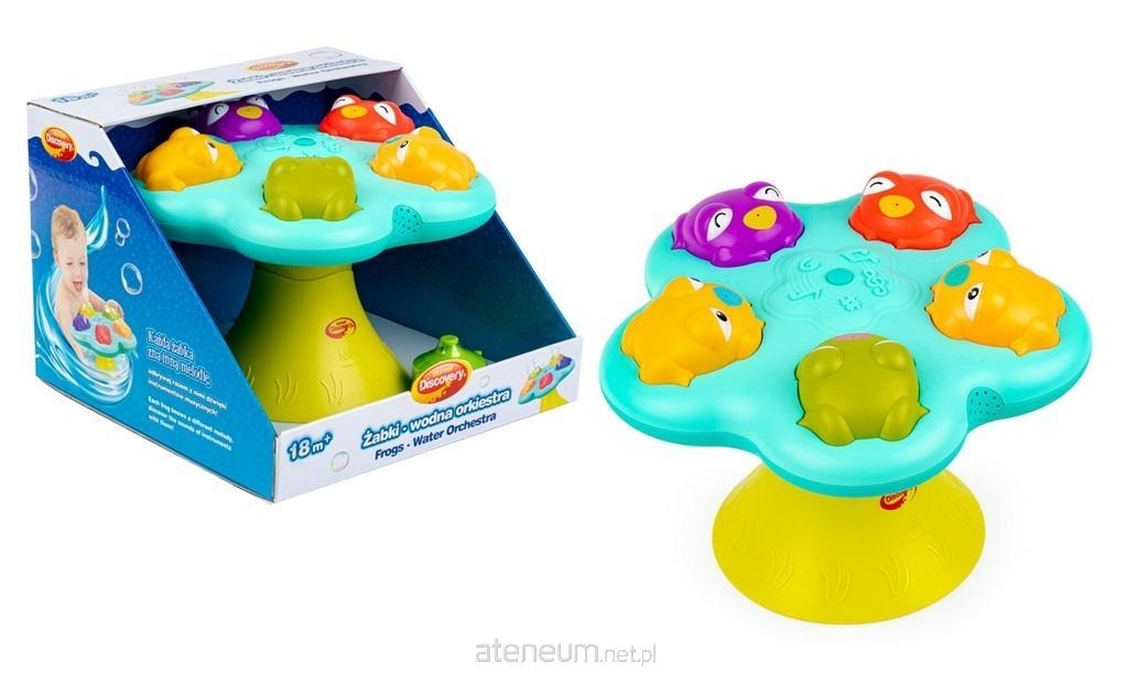 Zostań dyrygentem uroczej, żabiej orkiestry! Naciskaj żabki, aby bawić się razem z nimi, przy wesołych dźwiękach, kolorowych światełkach i zróżnicowanych strumieniach tryskającej wody! Zapomnij o nudzie, każda z żabek zna inną melodię, dzięki czemu zabawa z nimi to prawdziwa frajda. Aby uruchomić zabawkę, należy długo przytrzymać okrągły przycisk, znajdujący się na środku. Po uruchomieniu, każde kolejne, pojedyncze naciśnięcie guziczka spowoduje zmianę sposobu wytryskiwania wody. W zestawie poza fontanną, przypominającą staw, wypełniony żabkami, znajdziesz także przyssawki do przymocowania zabawki do gładkiej, czystej powierzchni.