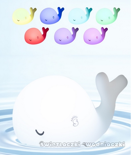 Lampka Wielorybcio to nie tylko zabawa w wodzie, ale także lampka pomocna w usypianiu.