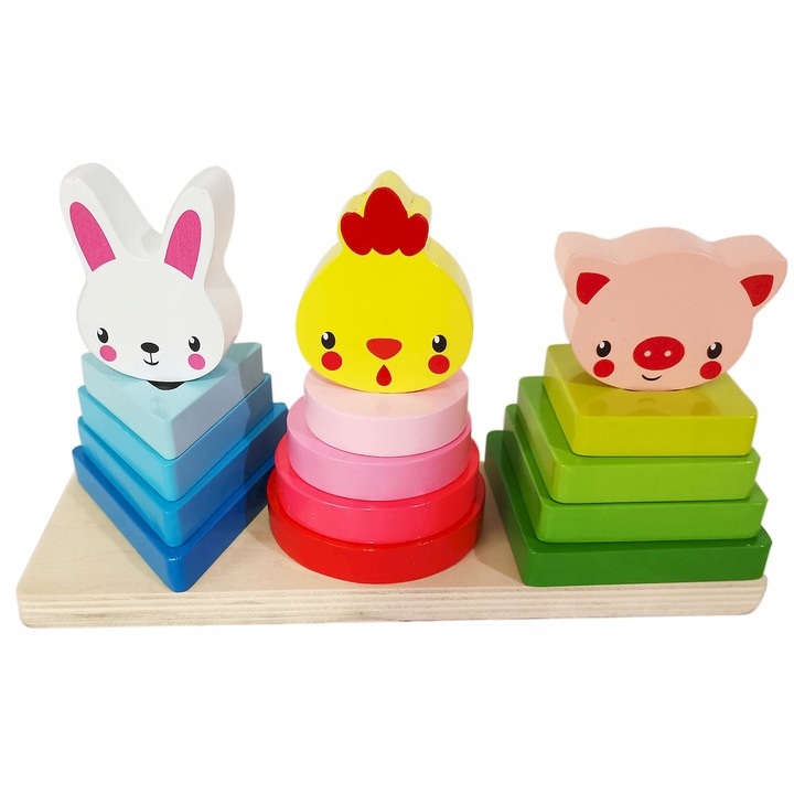 Drewniany sorter, trzy piramidki ze zwierzątkami to edukacyjna zabawka, która ćwiczy u dziecka sortowanie elementów, w kolejności od największego do najmniejszego. Uczy rozpoznawać kształty, kolory oraz zwierzęta.