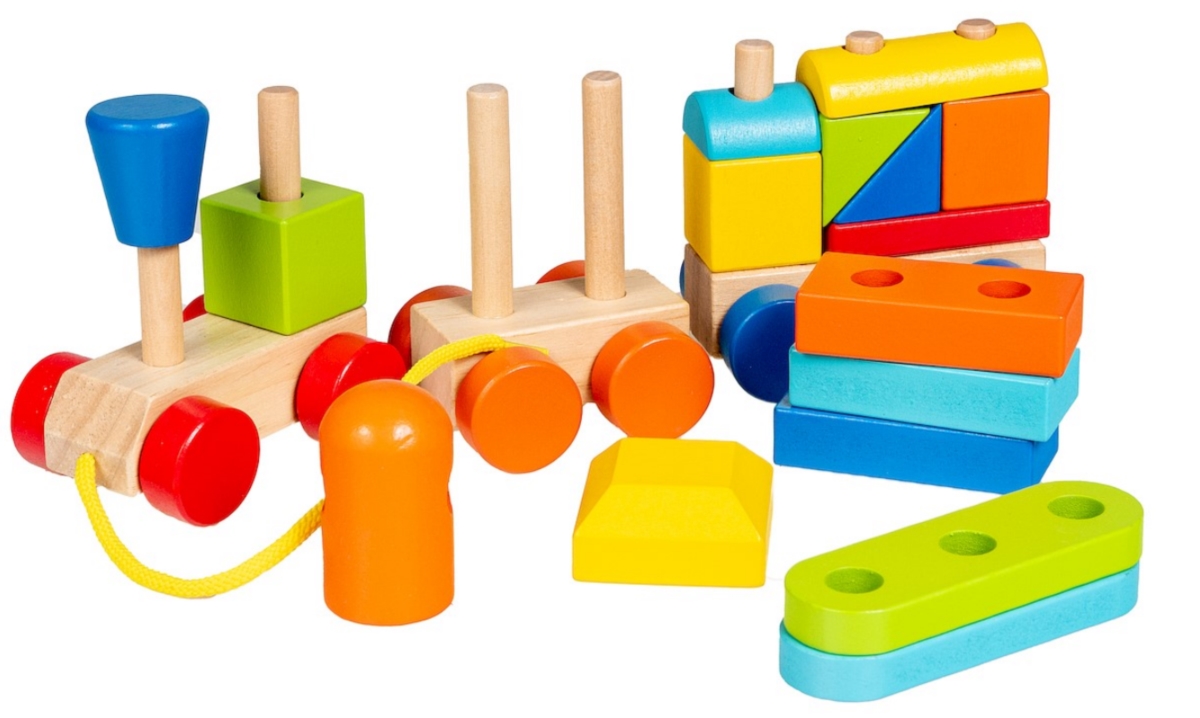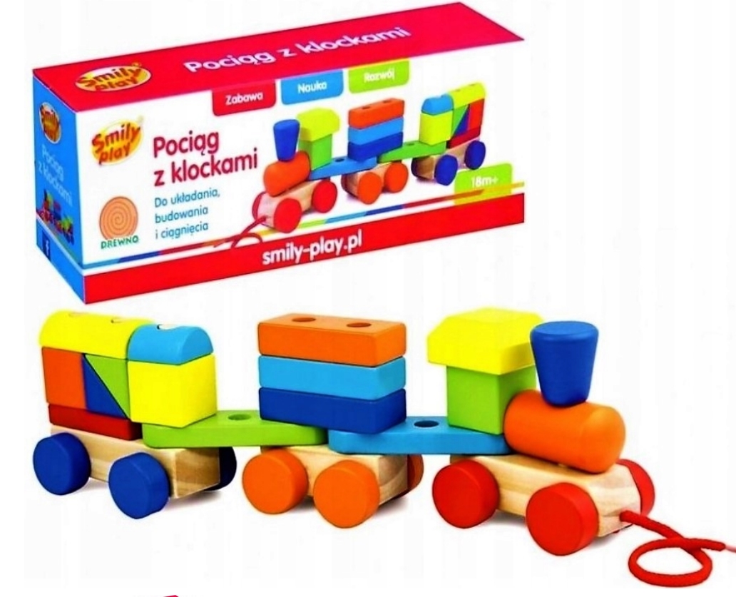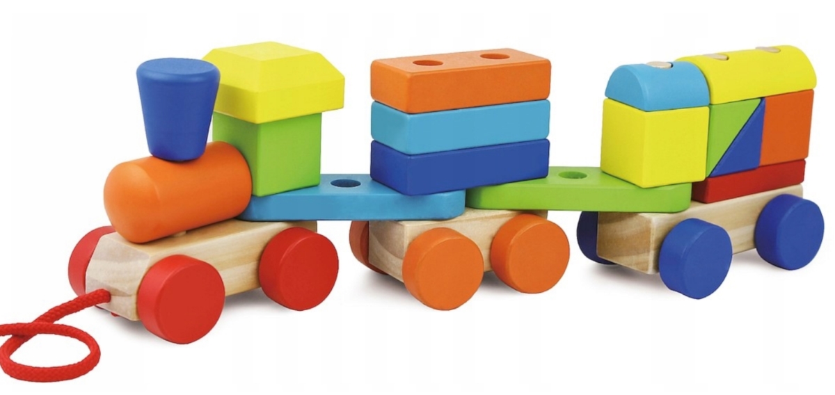 Pociąg z Klockami to drewniana zabawka, która rozwija sprawność małych rączek, koordynację wzrokowo-ruchową i wyobraźnię przestrzenną.