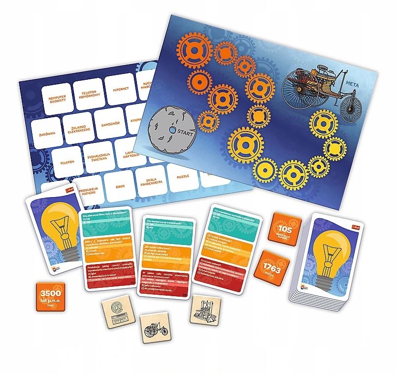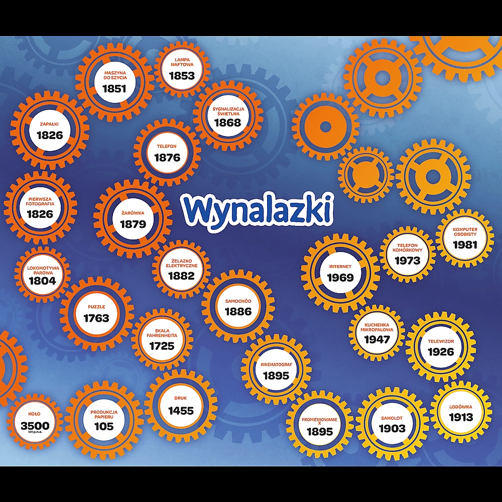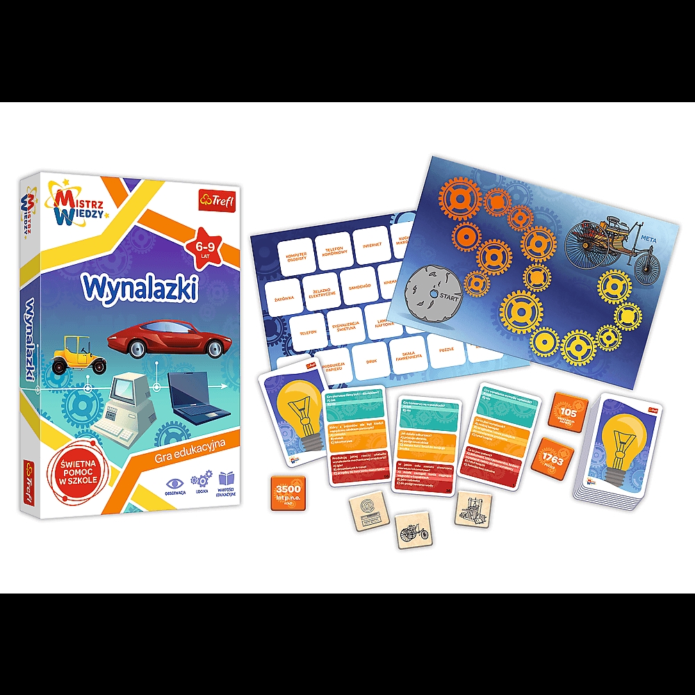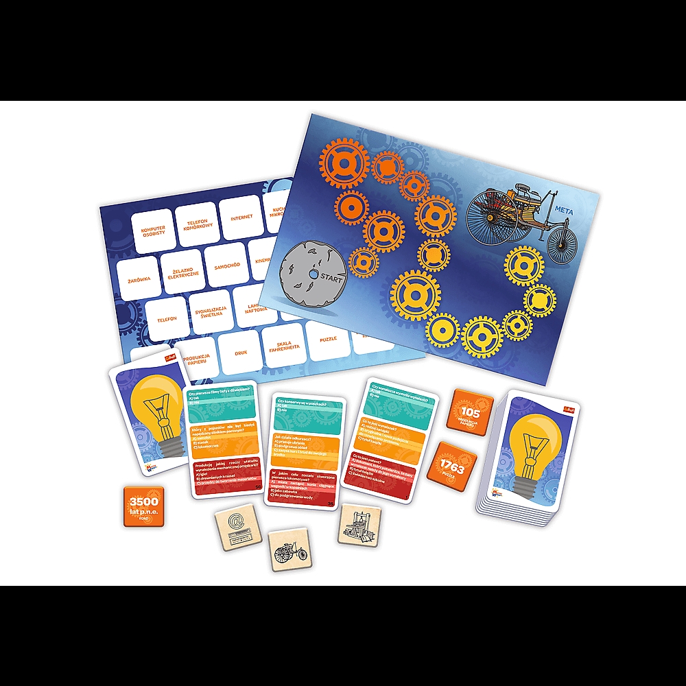 Wynalazki to edukacyjna gra dla dzieci, która łączy quiz, grę planszową, układankę i memos oraz uczy o przełomowych odkryciach w dziejach ludzkości w przyjemny sposób.