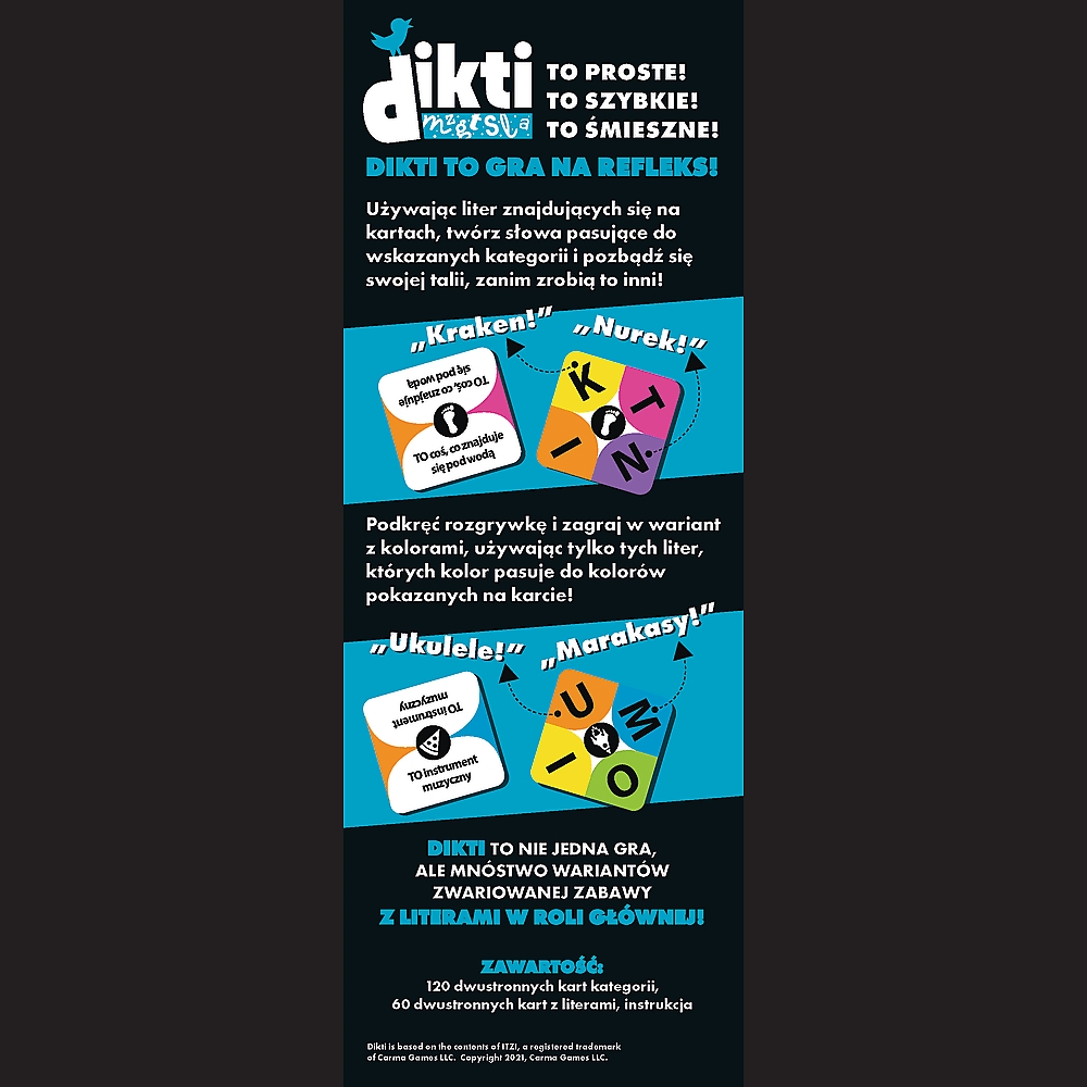 Dikti to zabawna gra słowna, w której musisz wykazać się refleksem i szybkością! Twórz słowa zaczynające się od liter pokazanych na kartach, pasujące do wskazanych kategorii. Bądź szybki i pozbądź się swojej talii przed innymi! Zaproś znajomych do zabawy i sprawdźcie swój refleks! Wiele wariantów rozgrywki, opisanych w instrukcji, gwarantuje różnorodność zabawy i wyjątkowe emocje.
