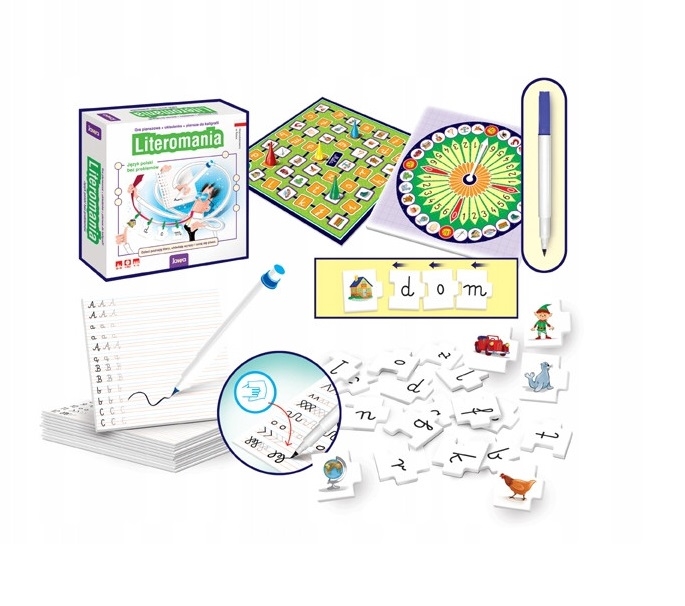 Gra planszowa i układanka dla dzieci w wieku 5-8 lat. Gracze poruszają się po planszy w kierunku mety i po drodze rozwiązują zadania - z liter tworzą wyrazy. Przygotowane karty i litery wspierają proces nauki alfabetu. Dzieci poznają litery, układają wyrazy i uczą się pisać. Do obrazka dopasowują odpowiednie litery, tak aby powstała nazwa przedmiotu. Dwustronne ścieralne plansze służą do kaligrafii - dzieci ćwiczą pisanie szlaczków, liter i wyrazów. Do gry jest dołączona instrukcja z różnymi propozycjami zabawy.