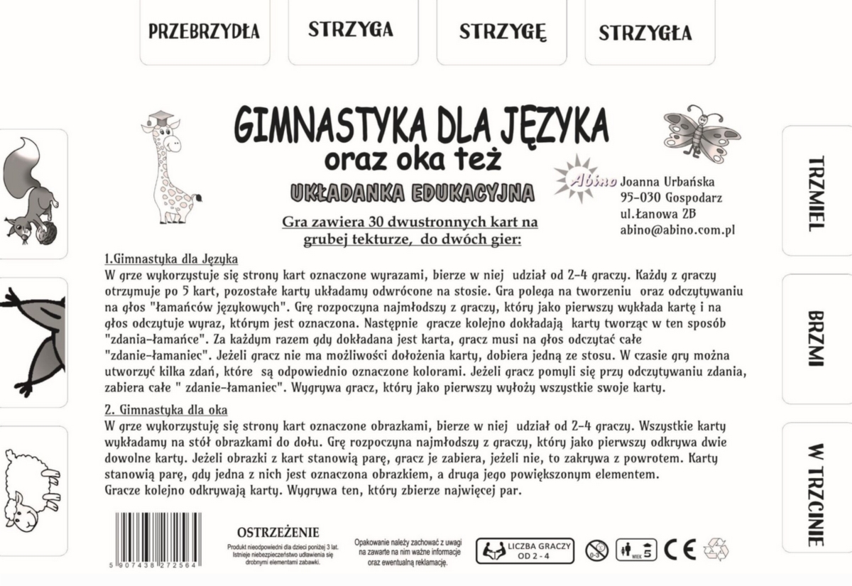 „Gimnastyka dla języka” to wciągająca układanka edukacyjna, która pomaga dzieciom w wieku 5-10 lat w rozwijaniu umiejętności językowych oraz percepcji wzrokowej. Gra zawiera 30 dwustronnych kart z zabawnymi ilustracjami i wyrazami, które dzieci mogą dopasowywać, tworząc pary obrazek-słowo. To doskonałe narzędzie do nauki i zabawy, które stymuluje rozwój mowy i wzbogaca słownictwo.