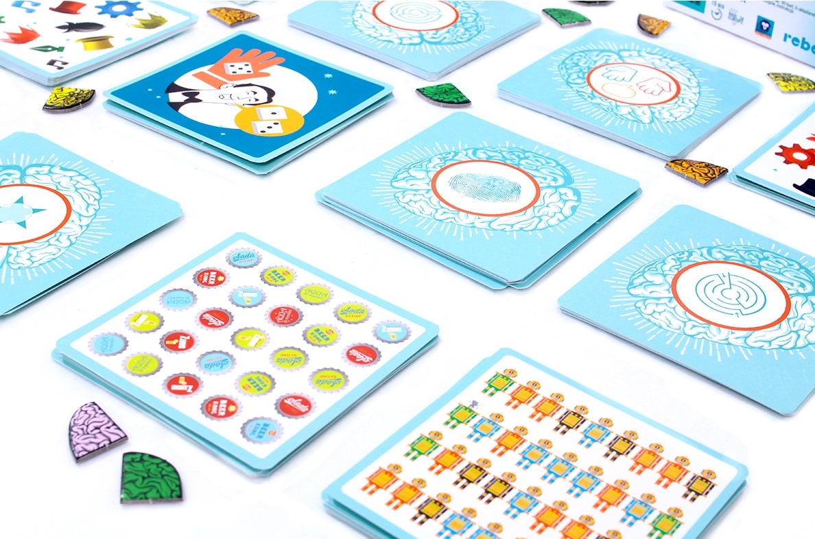 Zawartość: 90 kart (74 karty testów, 6 kart wyzwań, 10 kart faktur z wytłoczeniami), 6 układanek z obrazkiem kolorowego mózgu (razem 24 części).