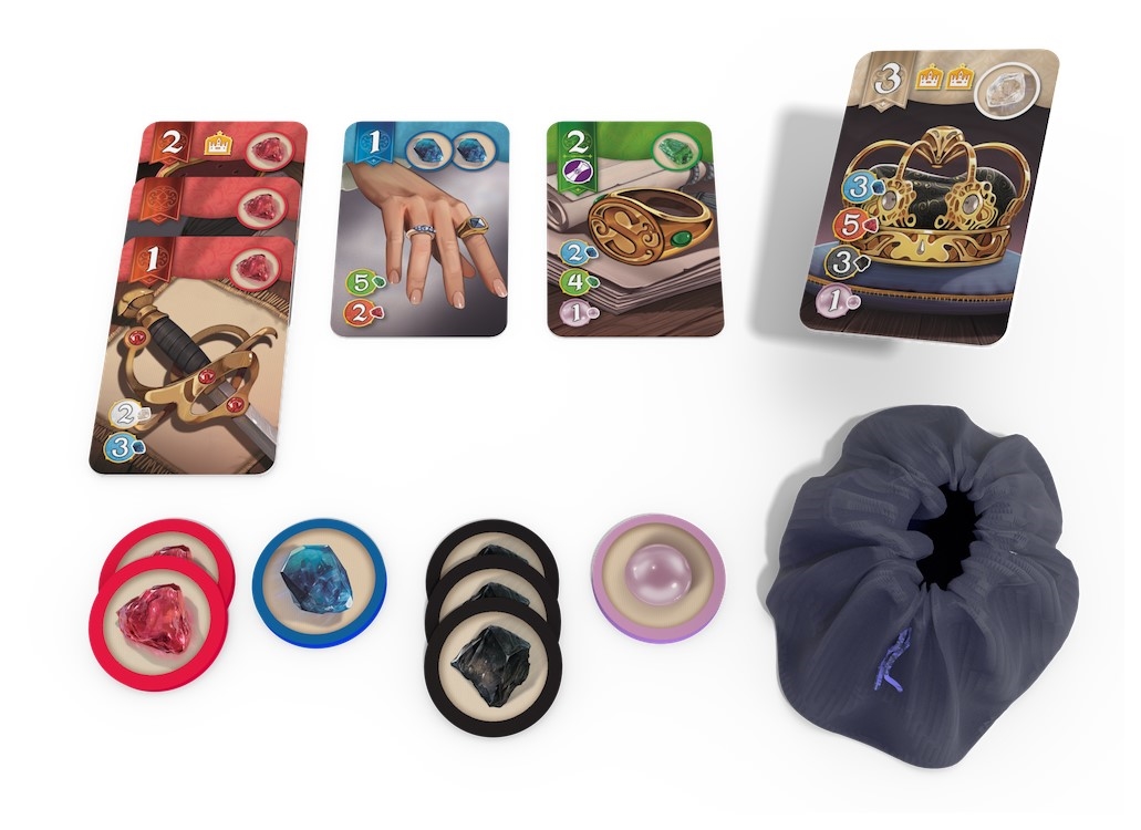 kafelek zwycięstwa, 67 kart klejnotów, 3 zwoje przywilejów, 25 znaczników, 4 karty monarchów, plansza, woreczek, instrukcja.
