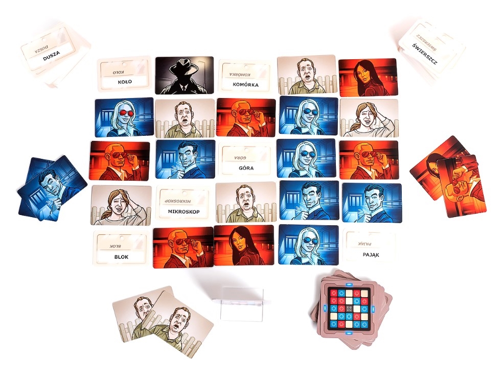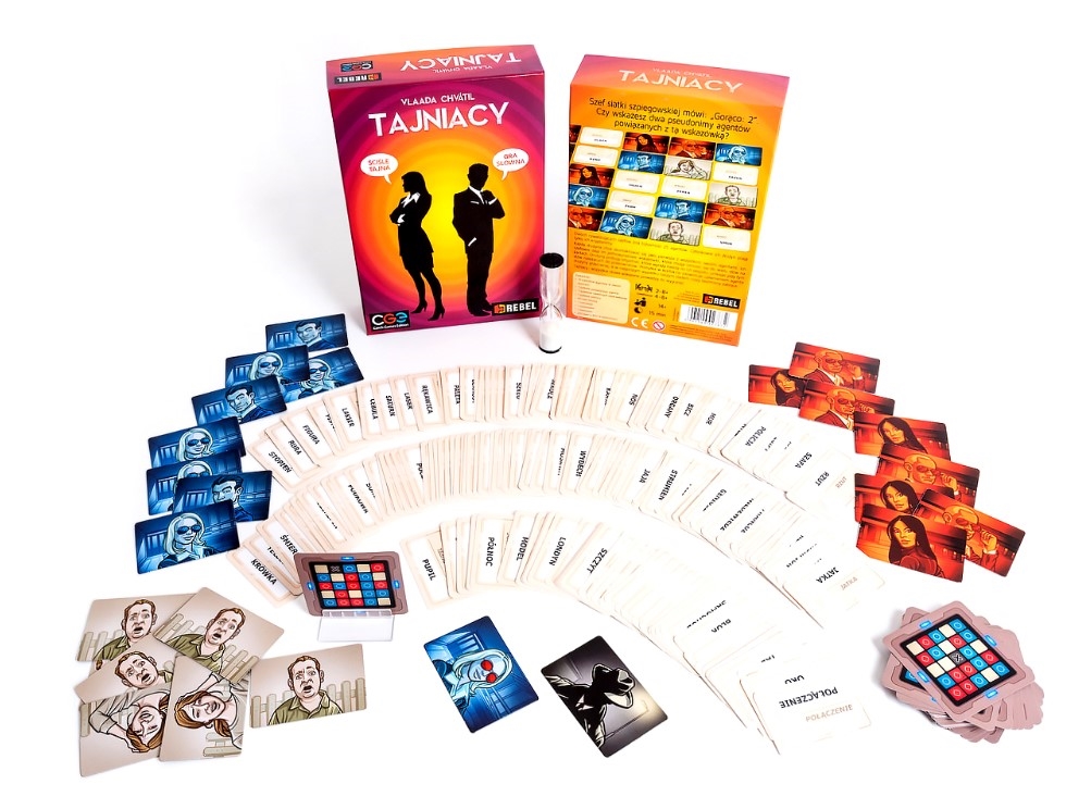 16 kafelków agentów w dwóch kolorach, 1 kafelek podwójnego agenta, 7 kafelków niewinnych obserwatorów, 1 kafelek zabójcy, 40 kart kluczy, 1 instrukcja, 1 podstawka, 1 klepsydra, 200 kart z 400 kryptonimami.