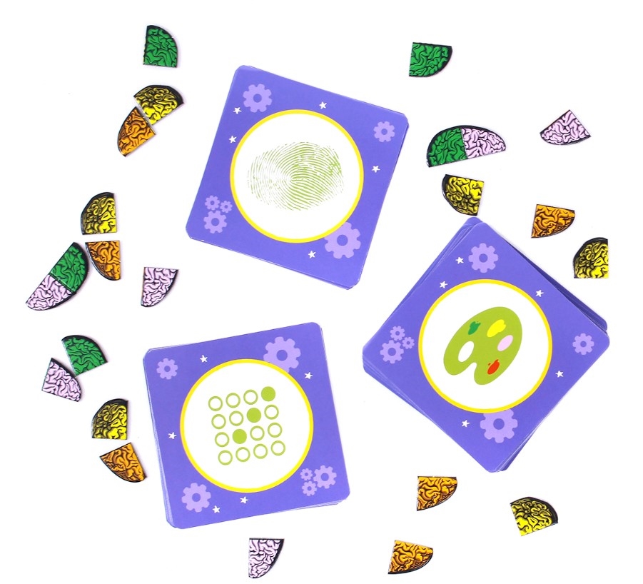 Zawartość: 90 kart (74 karty testów, 6 kart wyzwań, 10 kart faktur z wytłoczeniami), 6 układanek z obrazkiem kolorowego mózgu (razem 24 części).