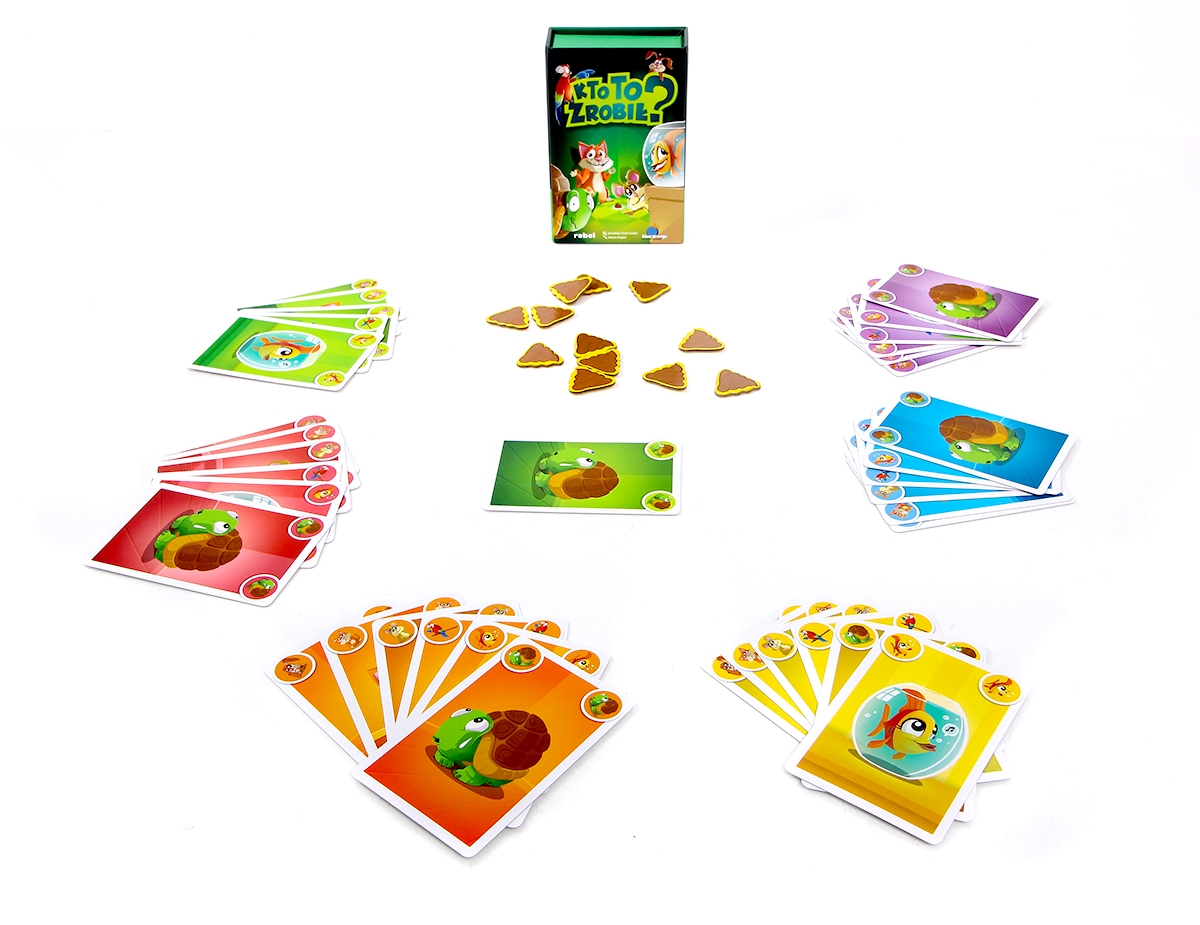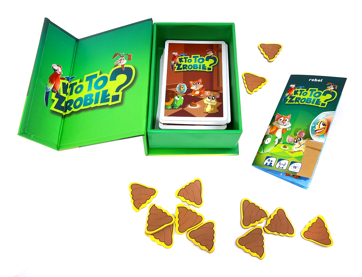 Kto to zrobił? to dynamiczna i bardzo prosta karcianka, w której liczy się refleks, szybkość reakcji i zapamiętywanie. Cała sprawa dotyczy kupy, którą jakieś zwierzątko zrobiło na środku salonu. Poszukiwania winnego trwają i choć wiesz, że to nie jest sprawka Twojego pupila, jednego możesz być pewien - pozostali gracze z pewnością będą próbowali go obwinić, żeby zrzucić winę ze swoich podopiecznych.