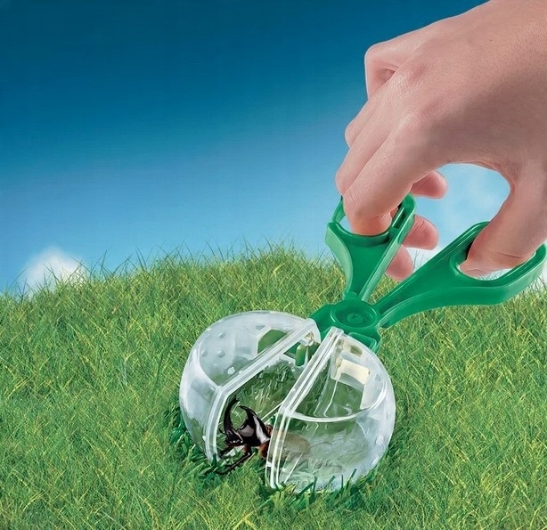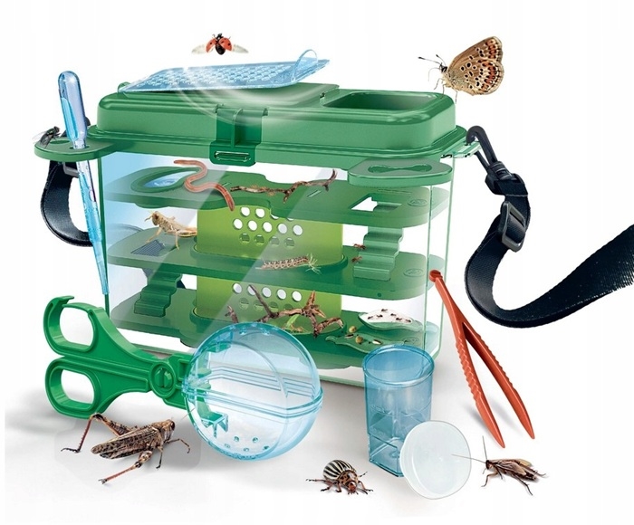 Zestaw zawiera przenośne faunarium z piętrowym domkiem, szczypce, szkło powiększające, pojemniki, nożycowy przyrząd do chwytania i pasek na ramię.