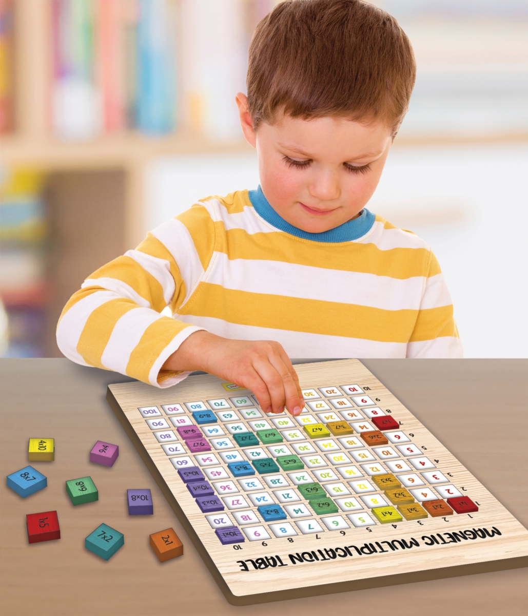 Drewniana tabliczka magnetyczna do nauki tabliczki mnożenia. Dzięki zastosowaniu kolorów na tabliczce i klockach przeznaczonych do wskazywania wyników, dziecko w prosty sposób jest w stanie samodzielnie dopasować odpowiedni klocek na swoim miejscu!.