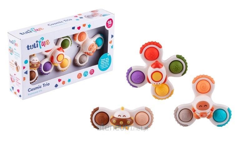 Kosmiczna zabawa z potrójną dawką sensoryki! W zestawie znajdują się trzy zabawki, a każda z nich wyposażona została w kolorowe elementy, stymulujące wzrok, w klikające kuleczki do wciskania, które stymulujący zmysł słuchu i zróżnicowane wypustki, stymulujące zmysł dotyku malucha. Dodatkowo, w zestawie znajdują się praktyczne przyssawki, pozwalające na przymocowanie zabawek do dowolnej płaskiej, gładkiej powierzchni i obracanie ich paluszkiem.
