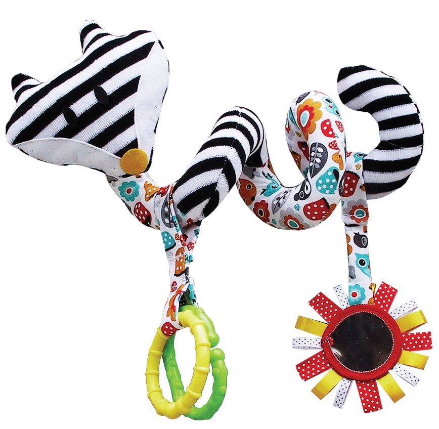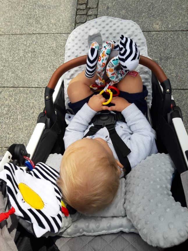 Mięciutka spiralka wózkowa od Moms care została stworzona z myślą o najmłodszych. To właśnie w pierwszym okresie życia dziecka kluczową rolę odgrywa stymulacja zmysłów. Do uszycia grzechotek używamy bezpiecznych tkanin o różnej strukturze. Dzięki temu dziecko poznaje świat i stymuluje zmysł dotyku. Nie zapominamy także o prawidłowym rozwoju zmysłu wzroku. Na samym początku nasze pociechy nie dostrzegają kolorów i nie odróżniają kształtów. Skupiając wzrok na biało-czarnych wzorach niemowlę zwiększa efektywność swojego mózgu.