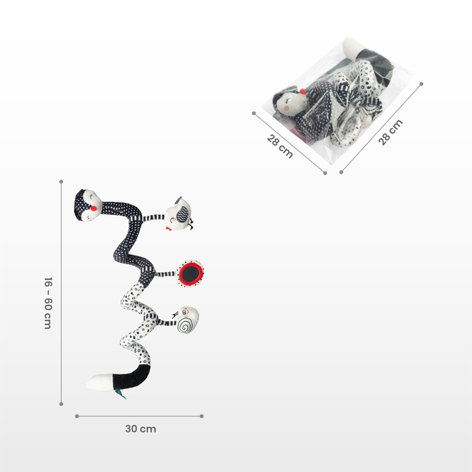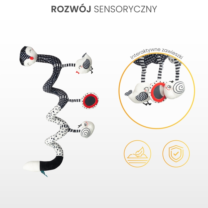 Zadbaj o rozwój sensoryczny swojego maluszka dzięki uroczej pluszowej spirali! To miękka, elastyczna zabawka, którą z łatwością zamontujesz na rączce wózka, foteliku samochodowym lub łóżeczku.