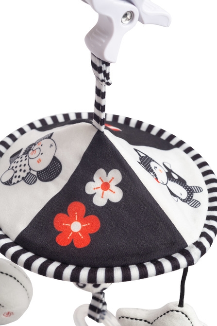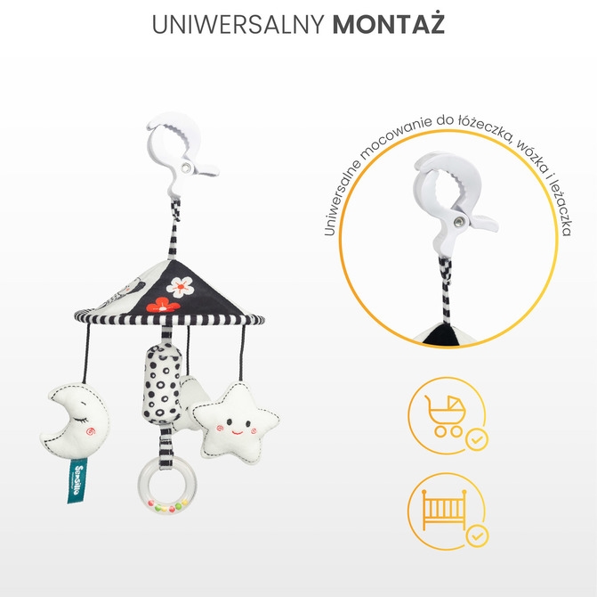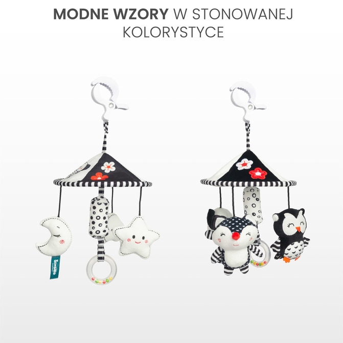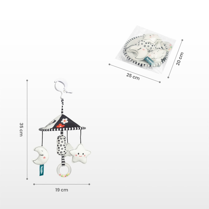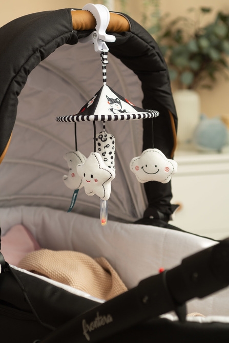 Dodaj odrobinę radości i atrakcji do spacerów z naszą elegancką karuzelą do wózka dziecięcego. Dzięki minimalistycznej czarno-białej kolorystyce idealnie wpasuje się w każdy wózek, wprowadzając harmonię i styl.