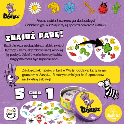 Żadna inna gra nie rozrusza towarzystwa tak jak Dobble. Żadna nie jest tak prosta i nie daje tyle zabawy w ciągu tych kilku minut! Rozgrywka jest bardzo szybka, emocjonująca, a przy stole dużo się dzieje, gdy każdy próbuje wyprzedzić innych uczestników w wyścigu do zwycięstwa.