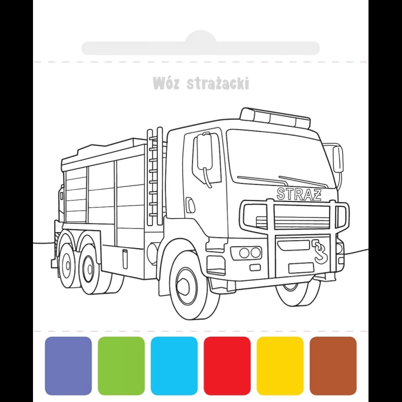 Malowanka z pędzelkiem i farbkami to propozycja dla małych artystów. Na każdej stronie znajduje się rysunek do pokolorowania oraz paleta z farbami. Dołączony pędzelek wystarczy zamoczyć w wodzie, wybrać kolor farbki i można zacząć kolorowanie. Perforacja ułatwia wyrywanie rysunków z książki. W malowance znajdują się następujące ilustracje do kolorowania: wóz strażacki, motocykl ścigacz, monster truck, samochód sportowy, dżip terenowy, traktor, buggy, kamper, quad, walec, duża wywrotka, samochód WRC, samochód dostawczy, chopper, autokar, kombajn, czołg, koparkoładowarka, skuter śnieżny, motocykl żużlowy. Ciekawa tematyka i odpowiednie dla dzieci rysunki bardzo różnych pojazdów oraz dołączony pędzelek i paleta z farbami zachęcą dzieci do pracy z książeczką. Zapraszamy do świata kolorów - użyj wody, zbudź kolory!