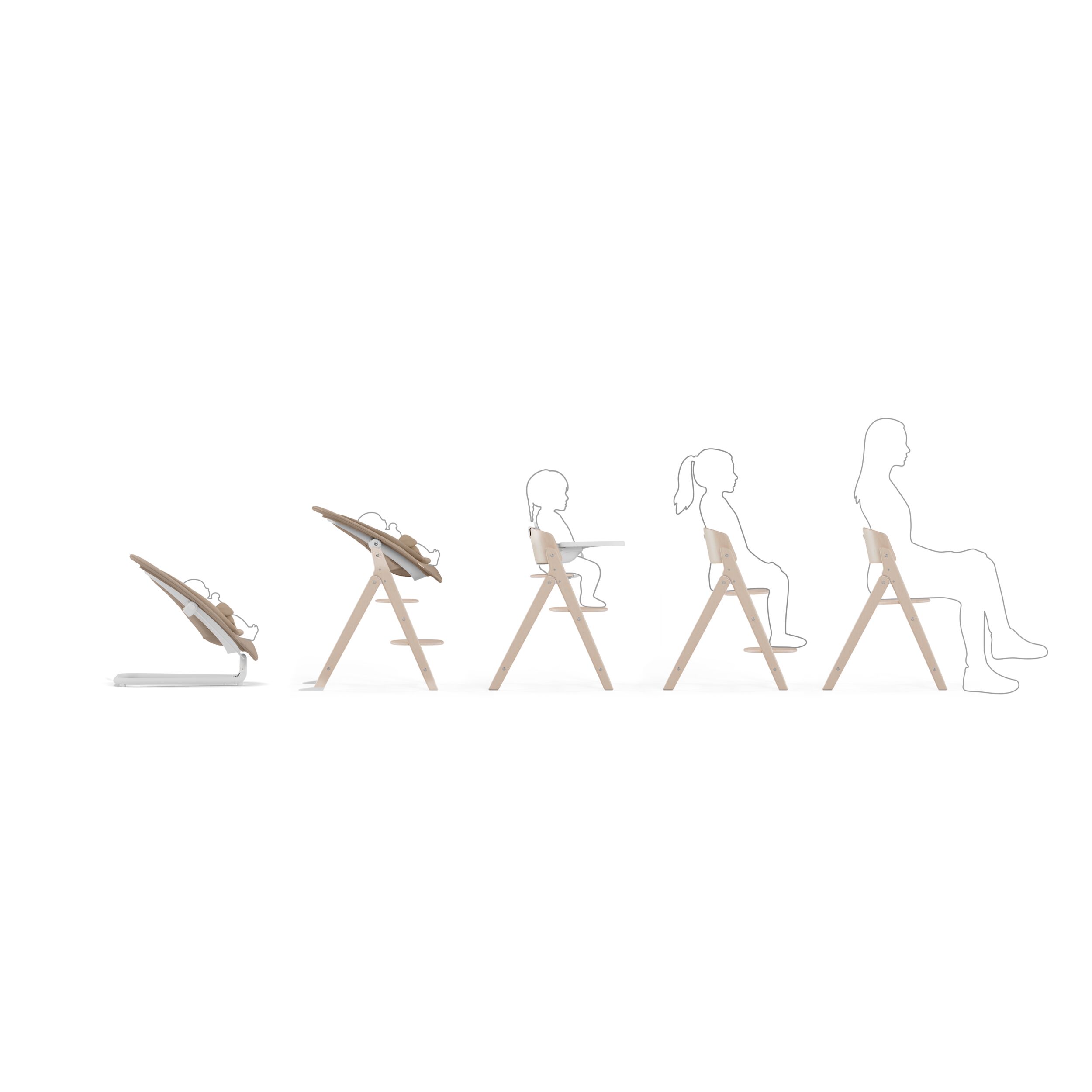 Dzięki zestawowi 4-in-1, kultowe wysokie krzesełko Click & Fold można używać od narodzin do 99. roku życia. Wykonane z litego drewna bukowego wysokie krzesełko można połączyć z bouncer nest lub zestawem niemowlęcym Baby Set z tacką, zapewniając rozwiązanie na lata.