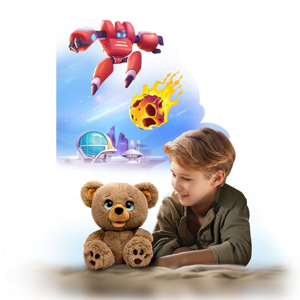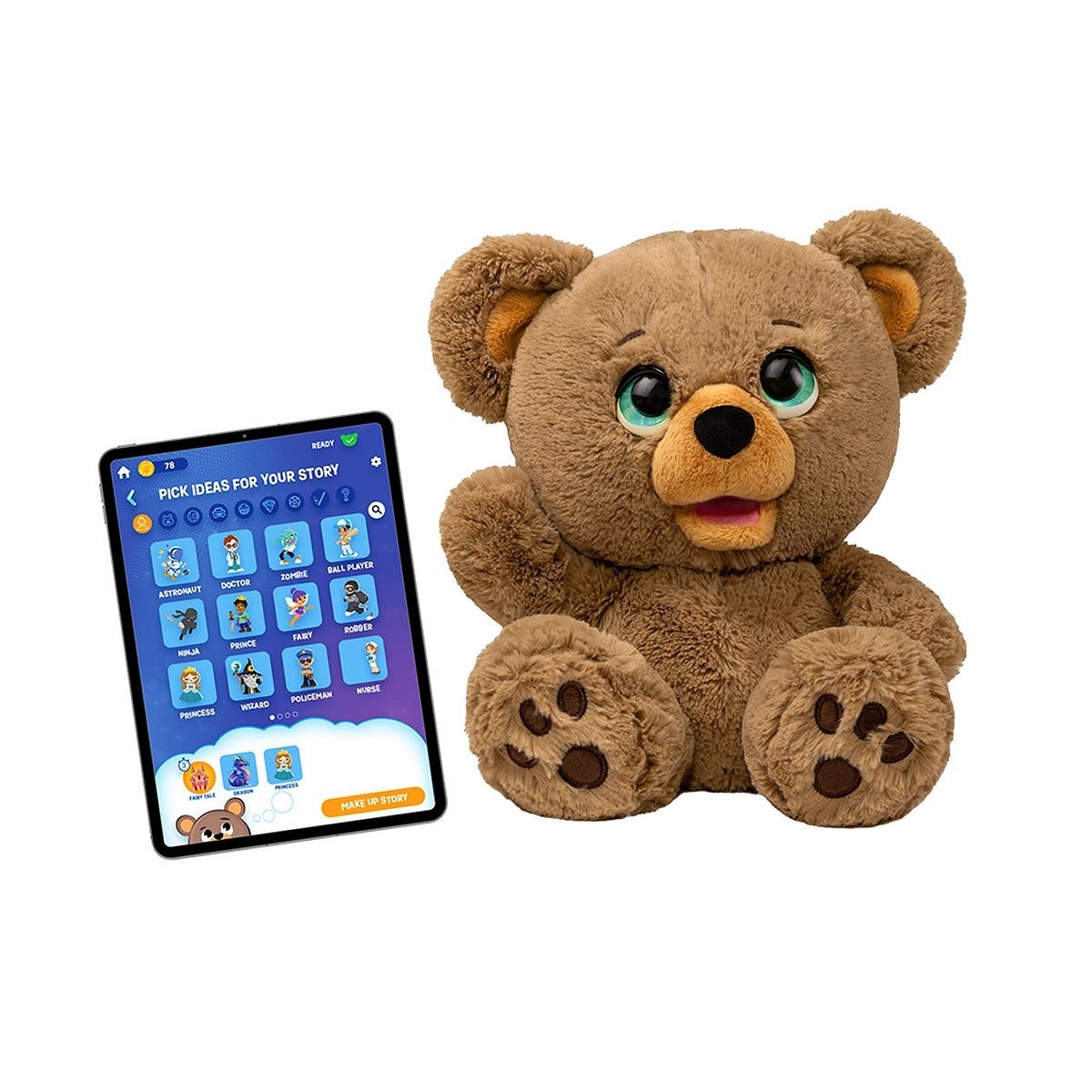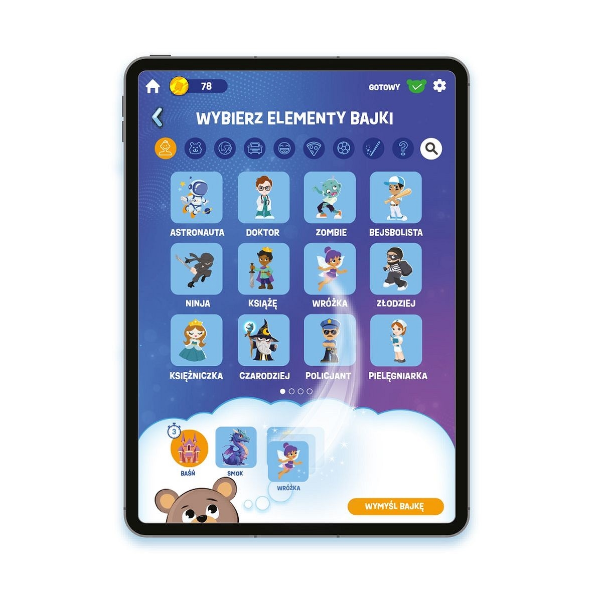 Miś współdziała z aplikacją, elementy bajki wybieramy w aplikacji.