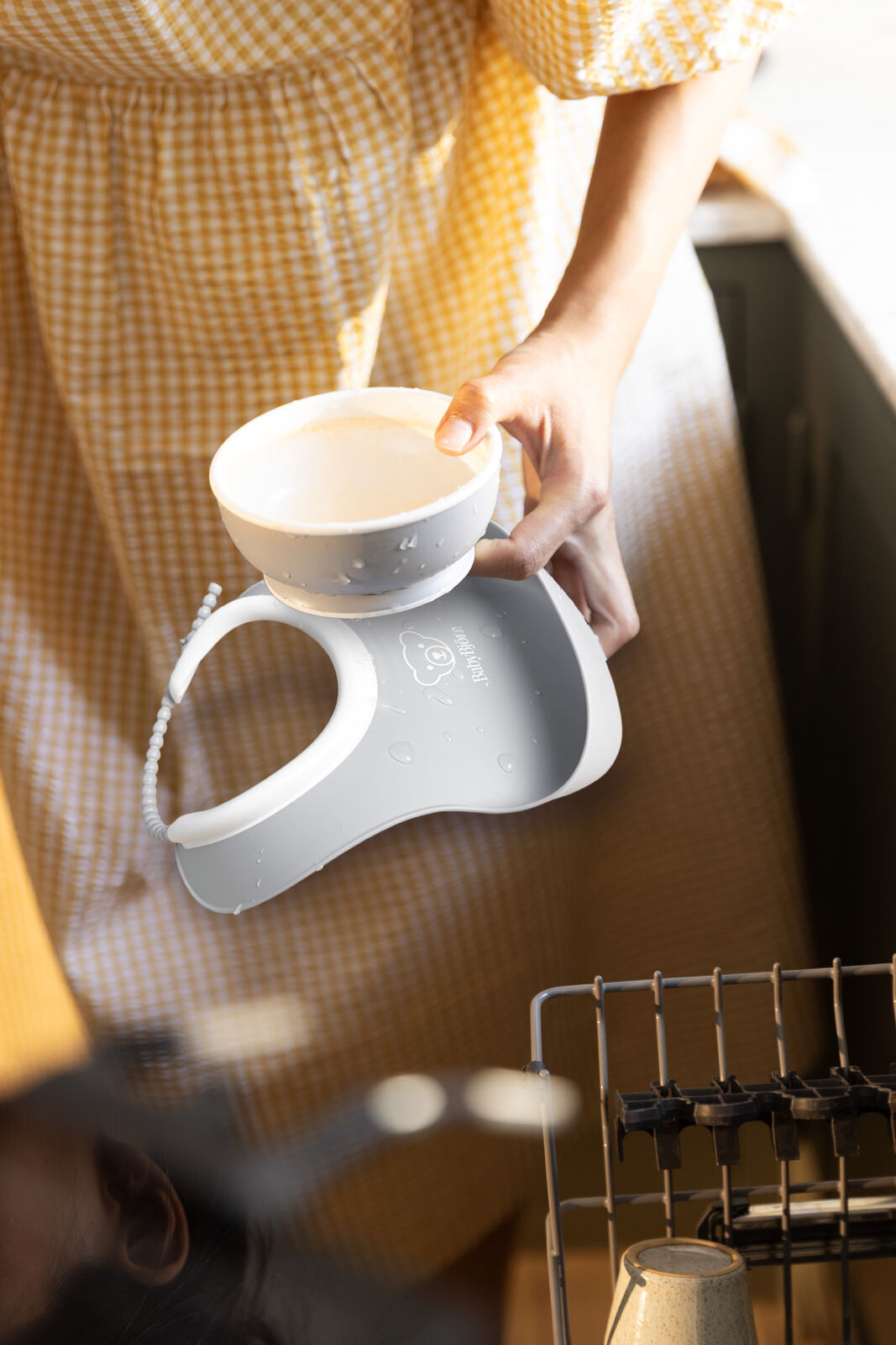 Solidna miseczka dla niemowląt, którą można łatwo trzymać podczas karmienia. Łyżka do karmienia z praktyczną długą rączką. Mały śliniaczek z wyjątkowo miękkim dekoltem.