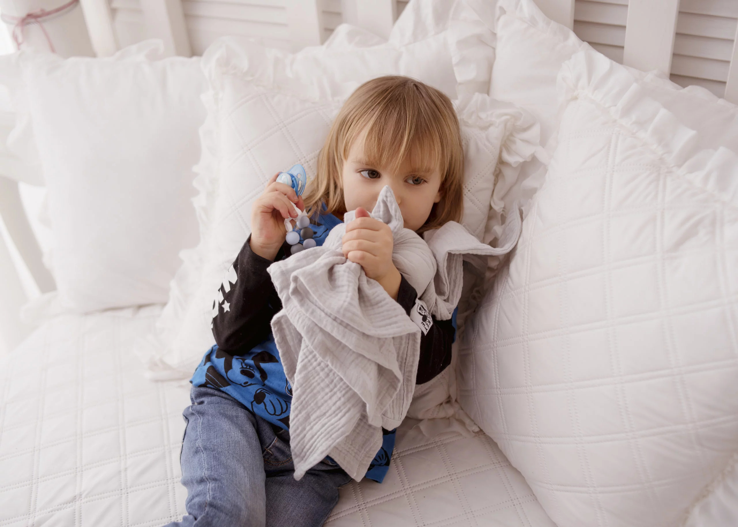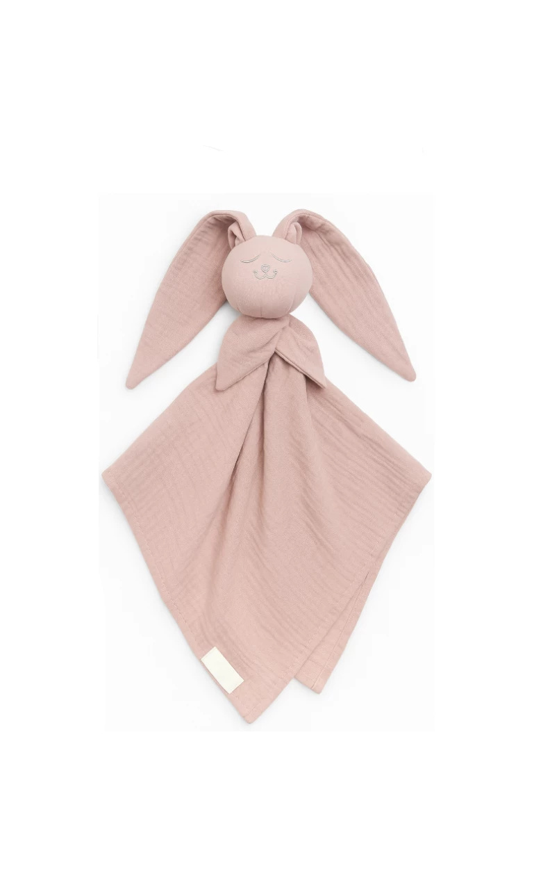 Jest wykonany z mięciutkiego i delikatnego muślinu bawełnianego. Główka wypełniona jest najwyższej jakości kulką silikonową, posiadająca certyfikat OEKO-TEX Standard 100, dzięki czemu przez długi czas nie odkształca się i nie traci sprężystości w trakcie długich zabaw.