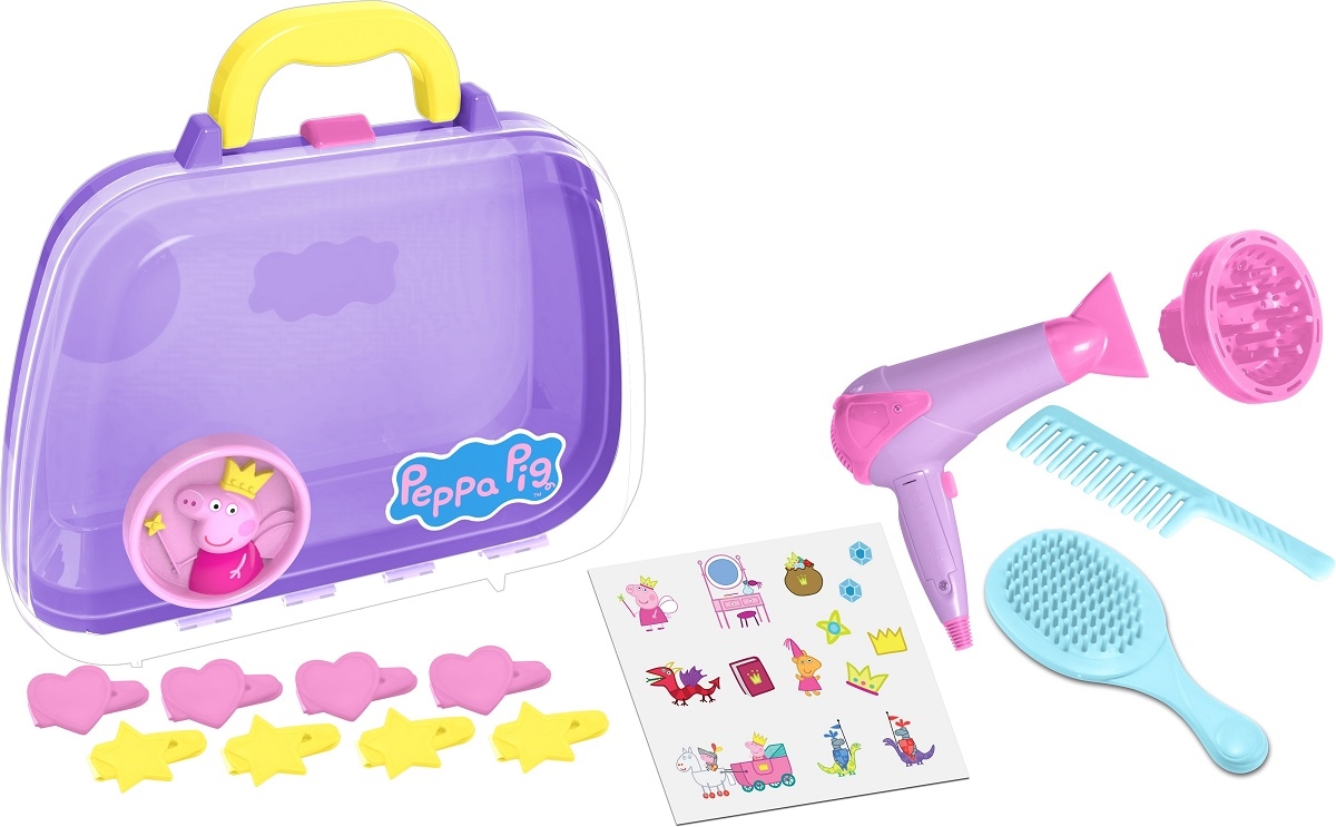Ta piękna walizka fryzjerska Świnki Peppy przyprawi każdą małą stylistkę o szybsze bicie serca! Walizka zawiera wiele różnych akcesoriów do stylizacji – w tym grzebień, szczotkę do włosów, spineczki, suszarkę do włosów oraz szablon naklejek. Robiąc wymyślone fryzury i ozdabiając włosy lalek pięknymi spinkami, dzieci ćwiczą motorykę i rozwijają swoją kreatywność.