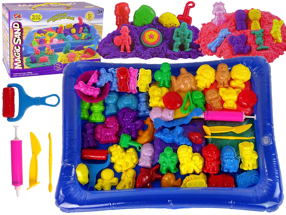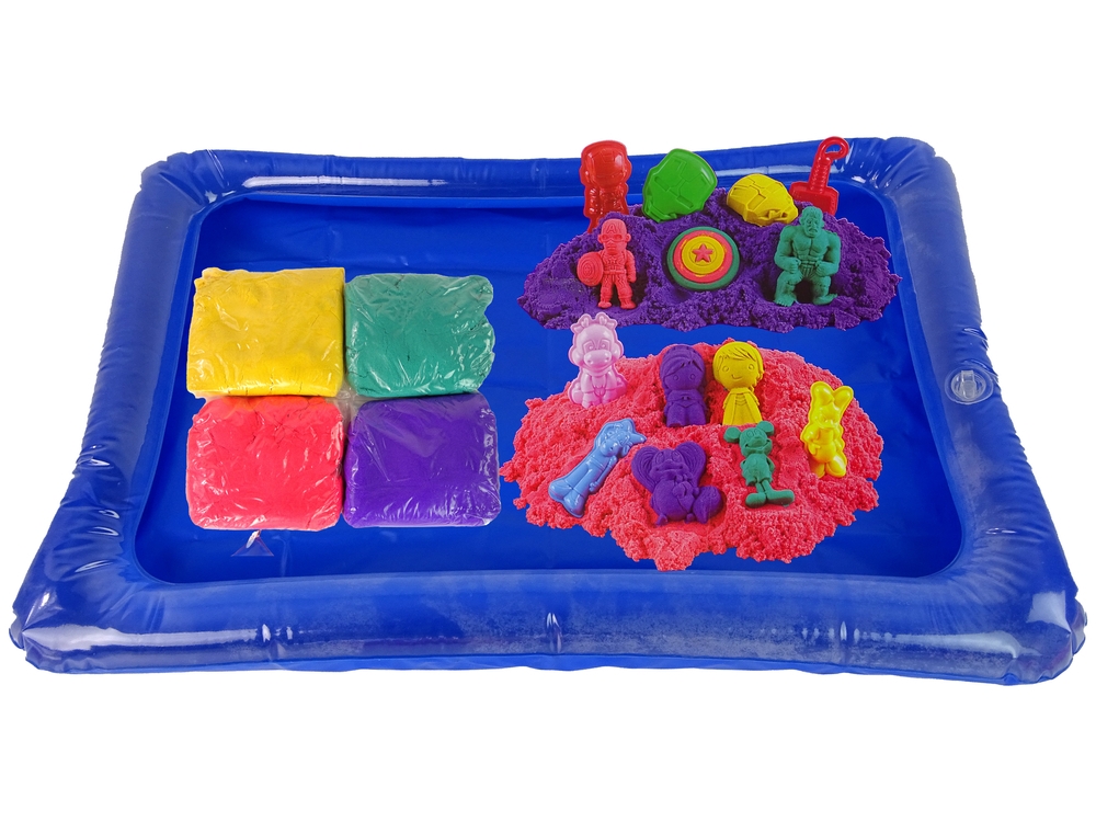 - 4 kolorów piasku kinetycznego: żółty, zielony, pomarańczowy, jasny brązowy, czerwony, niebieski
