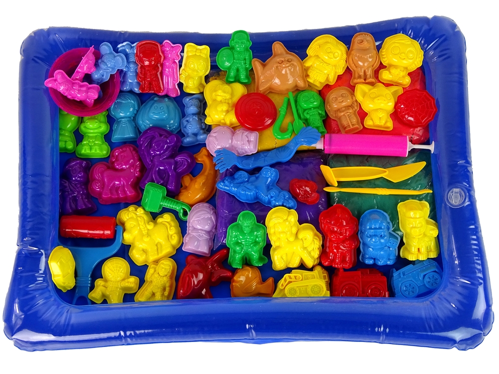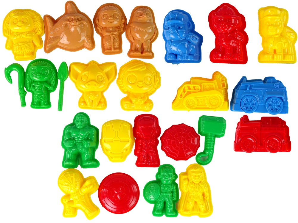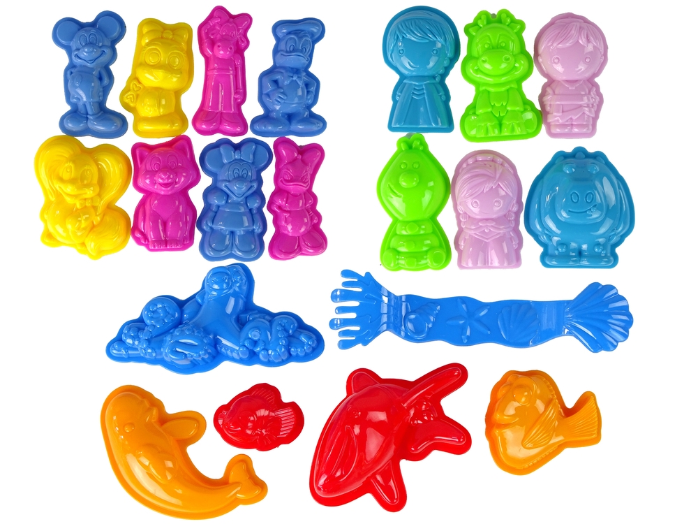 Zestaw zawiera formy różnych pojazdów, postaci oraz zwierząt. Foremki są wykonane z trwałych i bezpiecznych materiałów, dzięki czemu są odpowiednie dla dzieci.