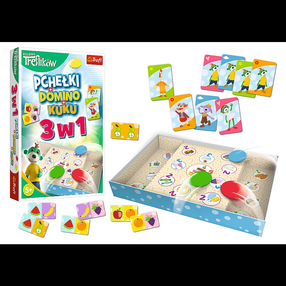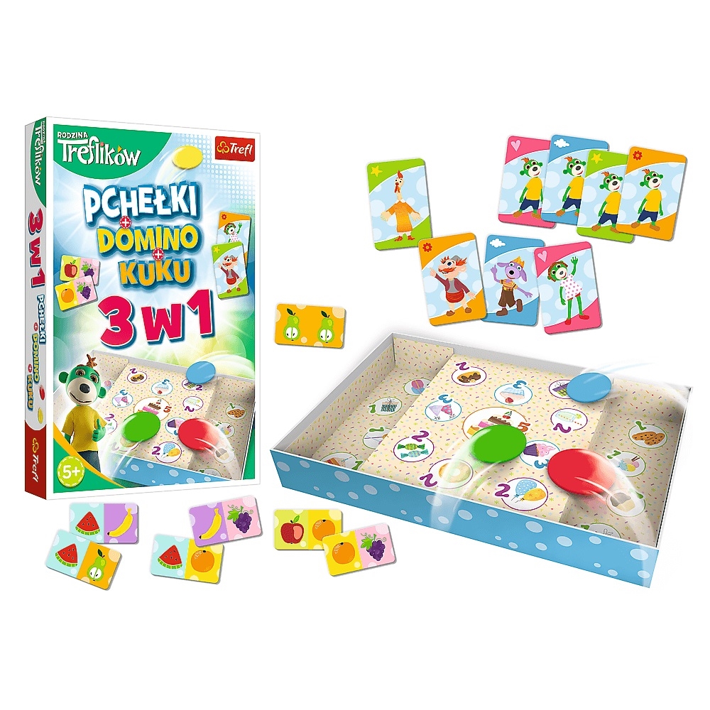 Zestaw gier 3 w 1 to świetna propozycja dla całej rodziny. Kolorowe Domino wprowadza dzieci w świat gier. Pchełki w nowej odsłonie rozwijają zręczność i celność. A popularna gra karciana Kuku to źródło emocjonującej rywalizacji, pełnej zabawnych zwrotów akcji.