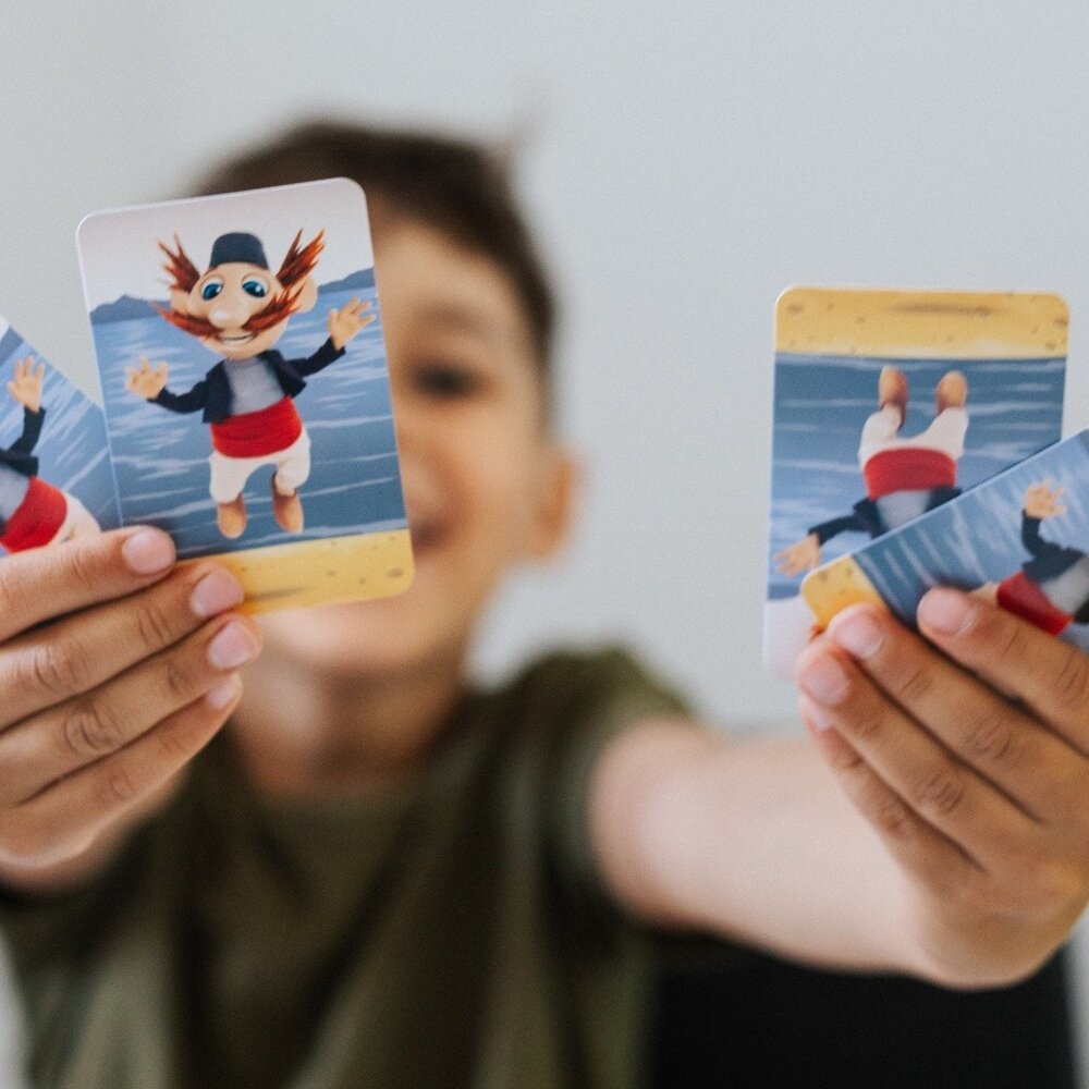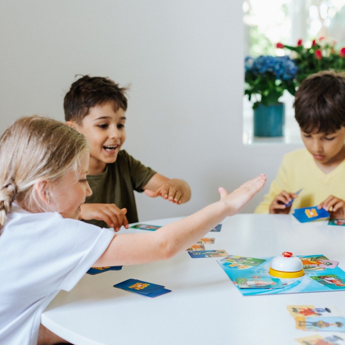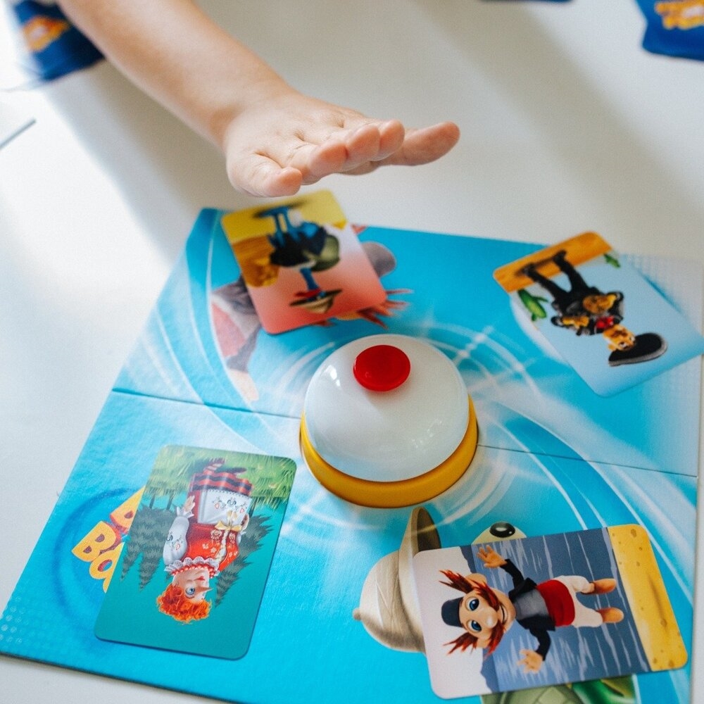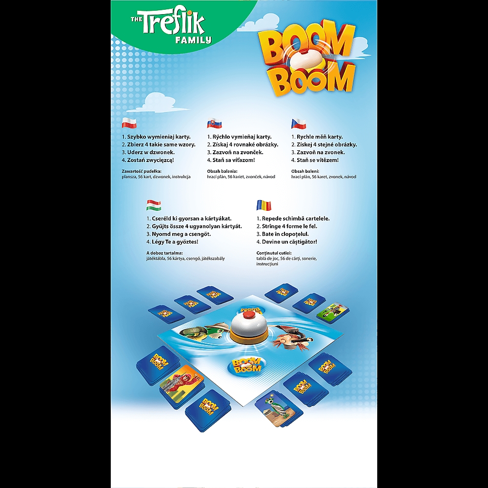 Boom Boom Rodzina Treflików to dynamiczna gra karciana, w której gracze kompletują zestawy tych zestawy tych samych wzorów, a wykonanie zadania oznajmiają uderzeniem w dzwonek.