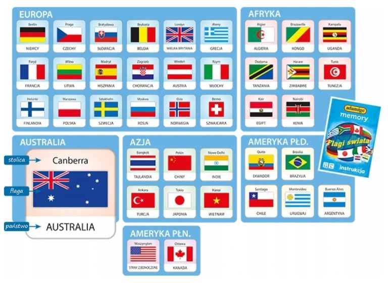 Gra ADAMIGO MEMORY jest doskonałą grą towarzyską dla wszystkich lubiących dobrą zabawę w wesołym klimacie. Rozwija pamięć, uczy koncentracji, zbliża rodzinę i uprzyjemnia wolne chwile. Tym razem młody gracz ma okazję zapoznać się z wyglądem aż 40 flag różnych państw z całego świata.