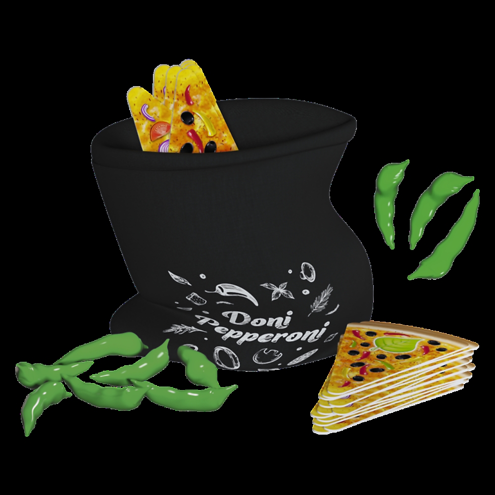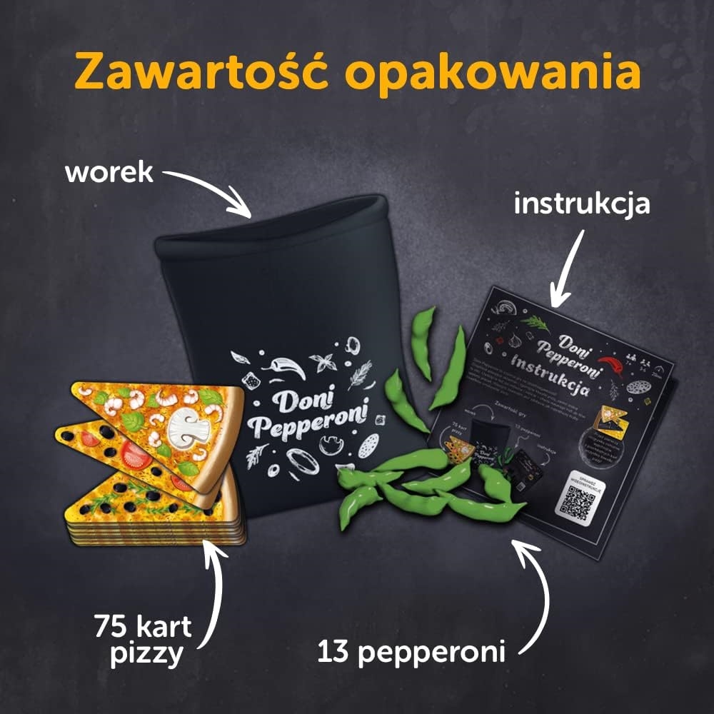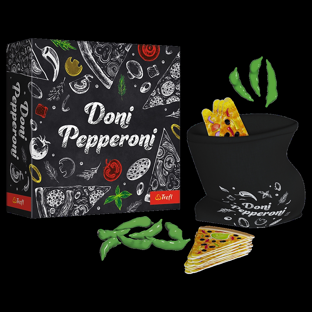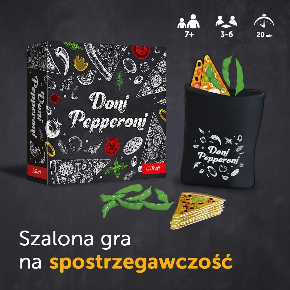 Dynamiczna gra towarzyska, w której liczy się refleks i spostrzegawczość. Zabierz ze sobą Doni Pepperoni i rozkręć domówkę. Gra przeznaczona jest dla 3-6 osób w wieku powyżej 7. lat, a przewidywany czas rozgrywki wynosi 15-30 minut. W opakowaniu znajdziesz: 70 kart w kształcie pizzy, 13 papryczek Pepperoni (punktów), wygodny worek do przechowywania oraz instrukcję.