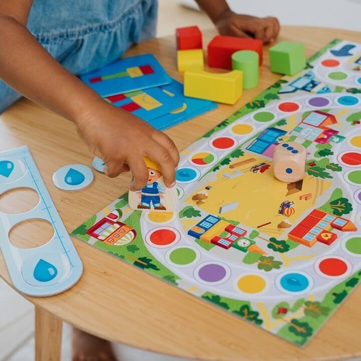 Gra Little Builder to wspaniała zabawa dla całej rodziny! Podczas kooperacyjnej rozgrywki dzieci ćwiczą sprawność manualną, pamięć i koncentrację, rozwijają wyobraźnię przestrzenną, zdolność logicznego myślenia oraz uczą się współpracy. Opakowanie zawiera planszę, 6 kolorowych, drewnianych klocków, 4 dwustronne karty z projektami budowli, deszczomierz z 4 żetonami kroplami, dużą drewnianą kostkę, drewniany pionek oraz przewodnik dla rodziców.