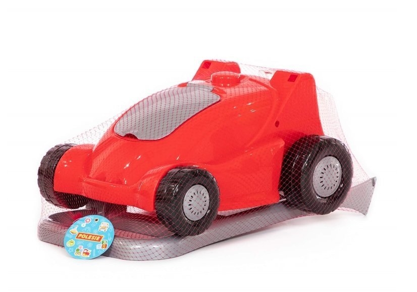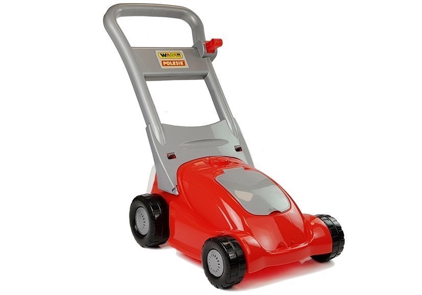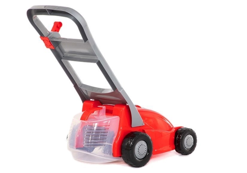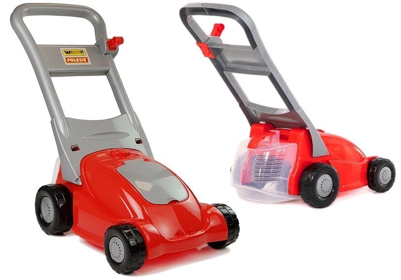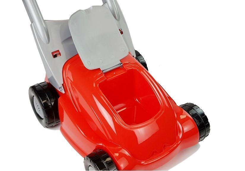 Kosiarka posiada zamontowaną szczotkę, która podczas popychania kosiarki kręci szczotkę, zamiatając po drodze większe rzeczy. Przy rączce znajduje się suwak po przesunięcie usłyszysz głosy silnika i odgłosy imitujące koszenie. Dodatkowo wyposażona jest w kosz do zbierania, a na przodzie znajduje się mniejszy schowek na drobne skarby malucha. Kolorystyka jaką utrzymuje to czerwono- srebrny.