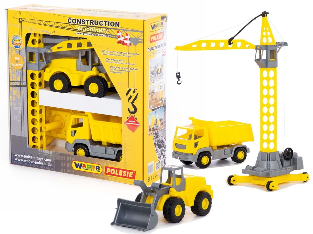 W skład zestawu wchodzą trzy pojazdy budowlane, bez których nie funkcjonowałaby żadna budowa. Wywrotka umożliwi wywiezienie zabawek z placu budowy, a unoszony kontener pozwoli na opróżnienie. Koparka posiada ruchome, szare ramię. Dźwig ma możliwość opuszczania haka, dzięki czemu można zaczepić i przenieść zabawki z miejsca na miejsce. Wózek utrzymany jest w kolorach żółto i szarym, ta kolorystyka kojarzy się z pojazdami budowy. Zapewni długie godziny zabawy na powietrzu oraz w pokoju dziecinnym. Wiele ekscytujących przygód przed nim, odgrywanie ról wpłynie na rozwój wyobraźni.