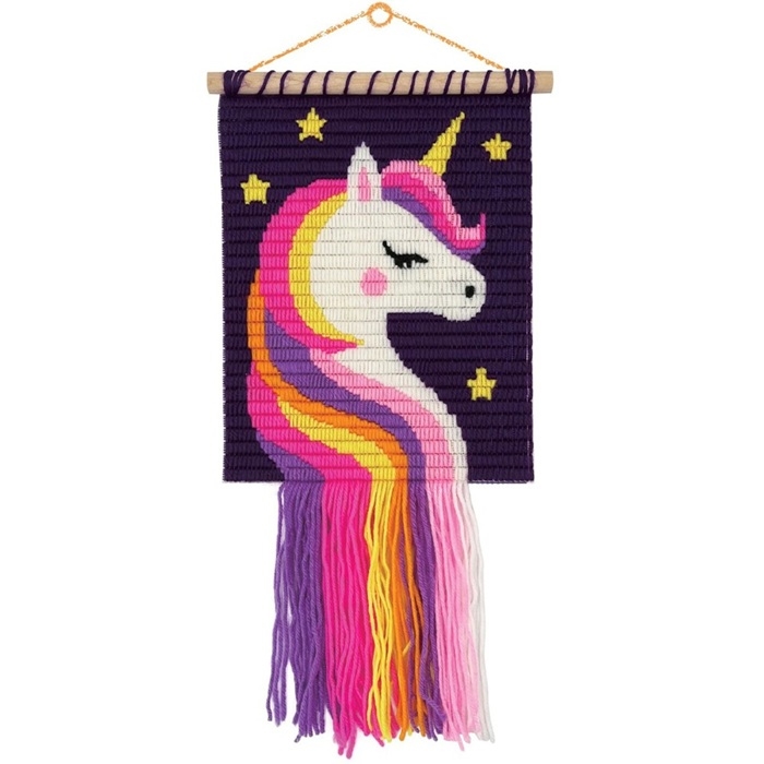 Kolorowa makrama do powieszenia na ścianie z drewnianymi elementami i frędzlami