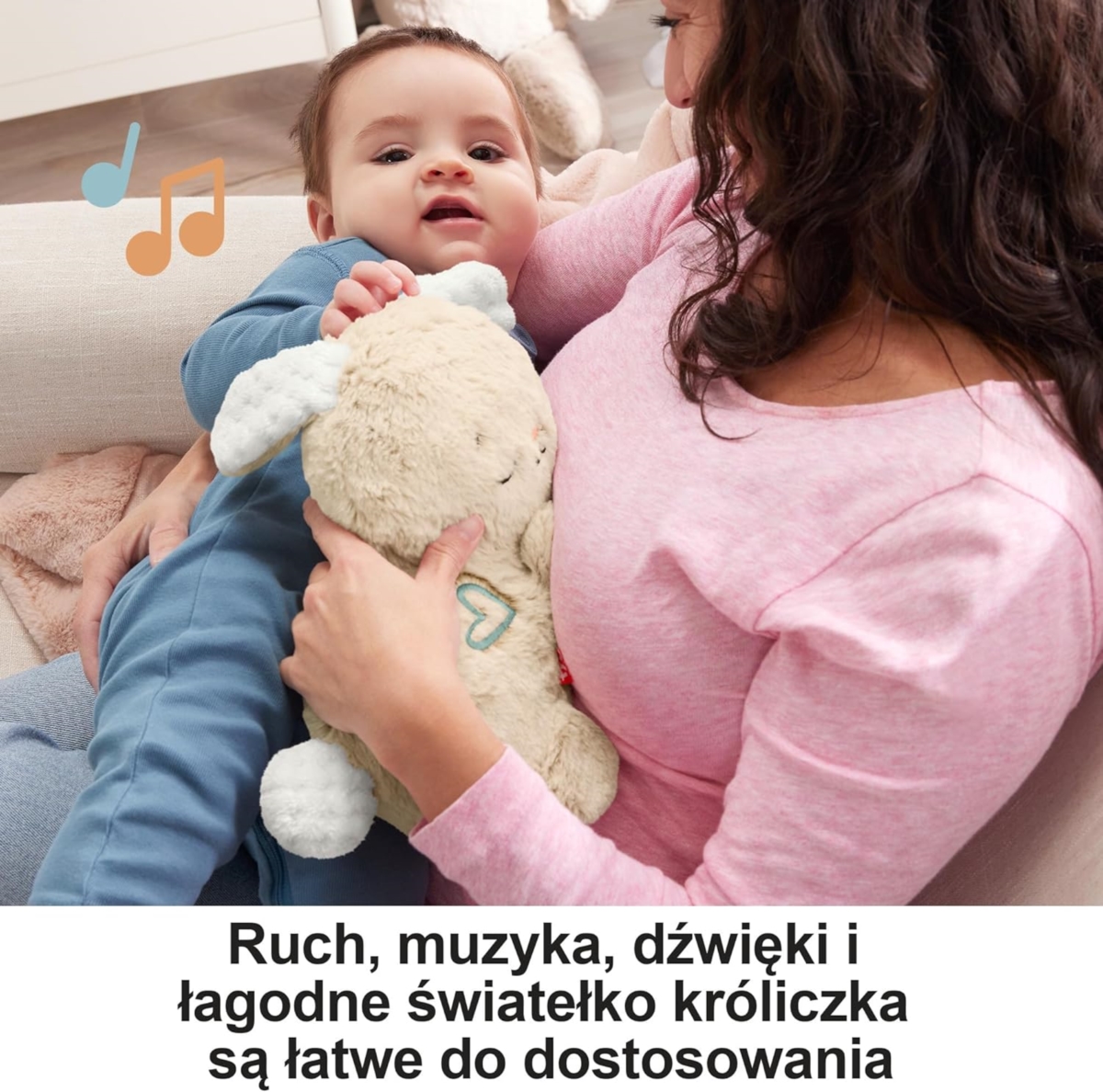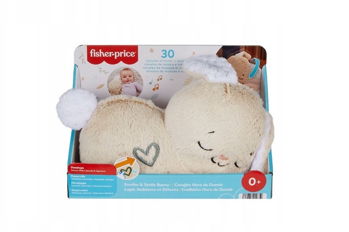 Mięciutki króliczek-uspokajaczek nadaje się do prania w pralce (po wyjęciu części elektronicznej). Z uśmiechem witaj każdy etap rozwoju dziecka! Ta zabawka pomaga w uspokajaniu przez rytmiczny ruch, ziewanie oraz łagodną muzykę i dźwięki, które naturalnie koją maluszka.