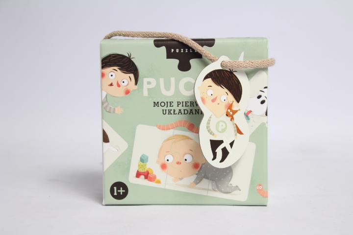 Pudełko zawiera 7 bardzo prostych układanek o wymiarach 9 × 18 centymetrów. Każda z nich jest podzielona na 3 elementy z typowymi dla puzzli wypustkami. Na poszczególnych obrazkach przedstawiono głównych bohaterów książek Marty Galewskiej-Kustry i Joanny Kłos: Pucia, Misię, Bobo, mamę, tatę, psa Funia i kotkę Mimi. Czyste, jasne tło ułatwia koncentrację na obrazku, dzięki czemu zabawka jest odpowiednia już dla rocznych dzieci. Te proste puzzle lepiej niż tradycyjne stymulują percepcję wzrokową oraz analizę wzrokową obiektu.