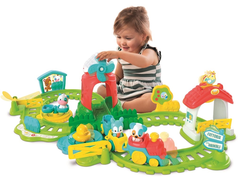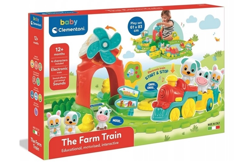 Pociąg mknie przez pełną atrakcji trasę, będącą zestawem do zabawy, osadzonym w świecie gospodarstwa rolnego. Po dotknięciu komina pociąg wyrusza w fantastyczną przygodę, w której towarzyszą mu przyjaciele: piesek, krówka, króliczek i kaczątko. Kiedy przejeżdża pociąg, farma ożywa: ramiona dźwigów podnoszą się, młyn zaczyna się obracać, a kogut i kaczątko wydają z siebie charakterystyczne dla nich dźwięki. Gdy zamknie się żółtą bramę, kaczątko zacznie „pływać” po stawie, a karuzela będzie się obracać. To dopiero zabawa. Stymuluje umiejętności manualne i koordynację wzrokowo-ruchową oraz pobudza wyobraźnię.