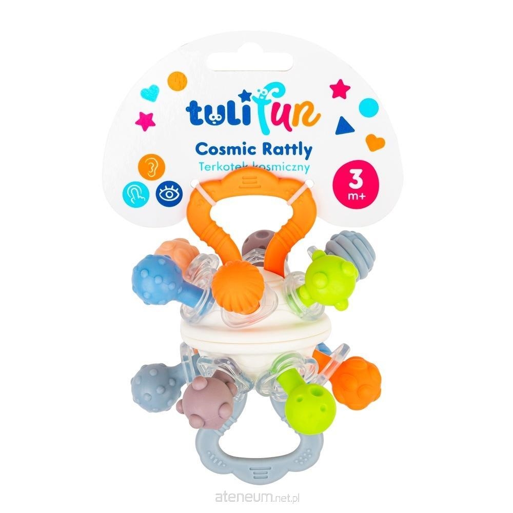 Ćwiczenie nadgarstków i ulga dla dziąsełek! Kolorowa zabaweczka posiada uchwyty z wypustkami, a po przekręceniu jej połówek w kierunkach odwrotnych względem siebie, wydaje zabawny dźwięk terkotania. Zarówno uchwyty, jak i fakturowane kuleczki sprawdzą się świetnie w roli gryzaka, co czyni terkotka nie tylko wesołą zabawką, ale też przydatnym akcesorium dla każdego bobasa.