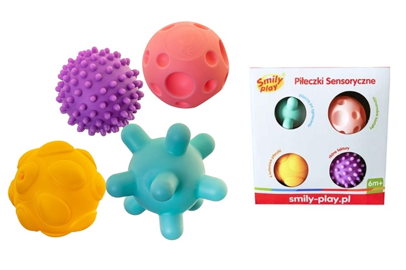 Miękkie piłeczki sensoryczne do zabawy dla maluszka. Dziecko chwytając piłki, odkrywa różne faktury; tocząca się kulka może również zachęcać do chwytania jej lub raczkowania.